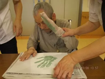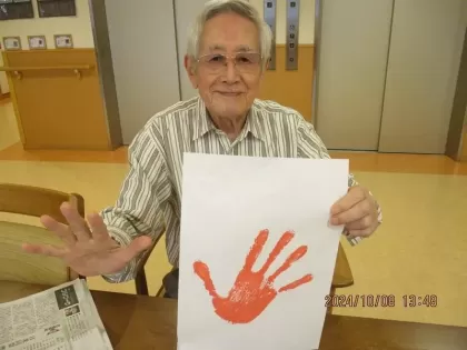 ご自分で選択された色で、「ヨイショ!」「どうだ!」と掛け声と共に、紙に手形をつけてくださいました。