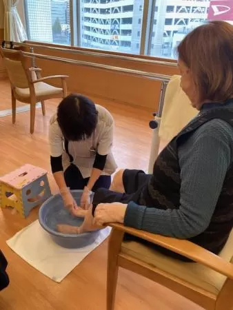 足浴をすることで、爪が軟らかくなり、爪が切りやすくなります。お一人おひとり、ナース全員で爪の様子や皮膚の様子を観察しながら、診察の介助をしています。