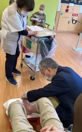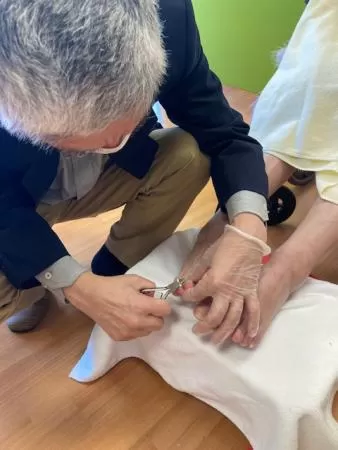 当施設では、月に1回、ますこクリニックの皮膚科・泌尿器科の先生が診察にきてくださいます。ご高齢の方は、皮膚のトラブルや、陥入爪、白癬などの爪のトラブルが多く、先生が毎月来てくださって、多くのお客様が喜ばれています。爪切りを実施したり、お肌の様子を丁寧に見てくださいます。