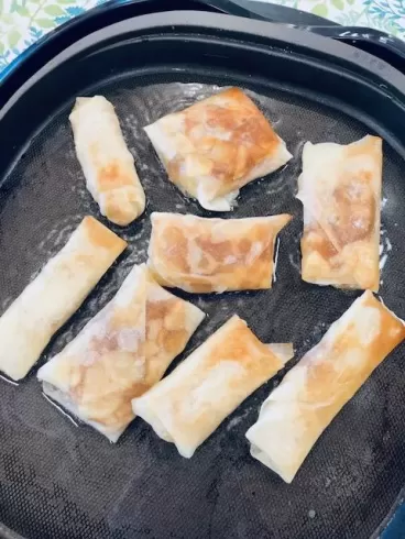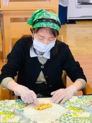 今月は春巻きの皮を使って煮込んだリンゴをご自分で包んでいただき、アップルパイをつくっていただきました。