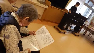 歌詞カードを見ながら、スタッフのピアノ演奏に乗せて歌っています。