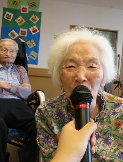 スタッフのリードのもと、昭和歌唱や演歌など、お客様一人ひとりが思い出の曲を口ずさみ、自然と声が重なって大合唱に。