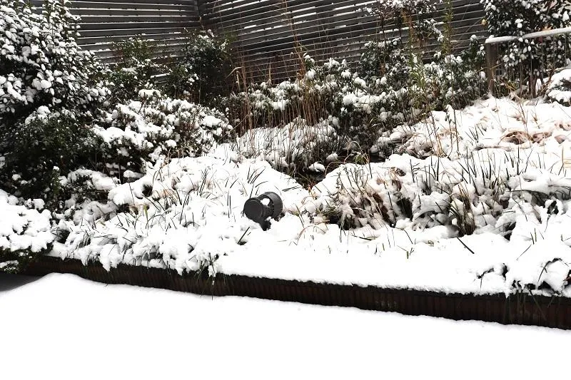 施設のウッドデッキにも雪が積もりました。