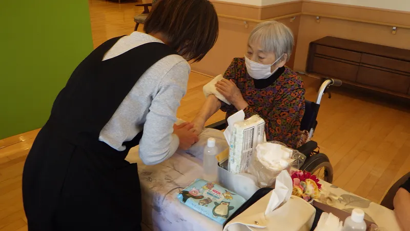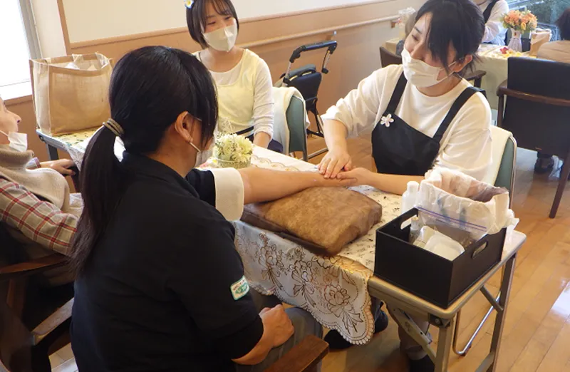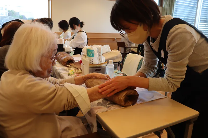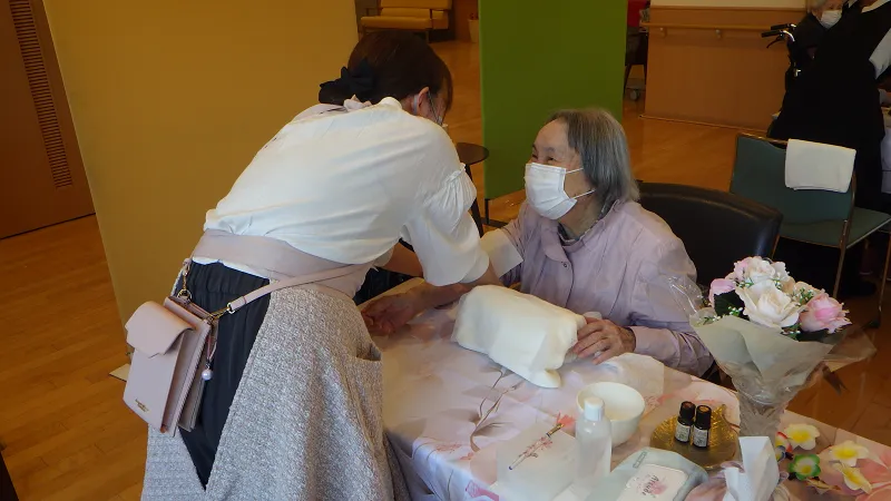 お客様の中には、「昔こういうのやってもらったことあるのよ」と思い出話をしてくださる方や、手のぬくもりに安心されたのか、ウトウトと目を閉じられる方もいらっしゃり、心も体もほぐれるような、あたたかい時間が流れていました。