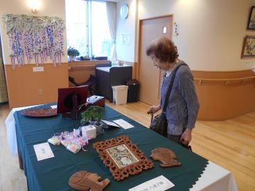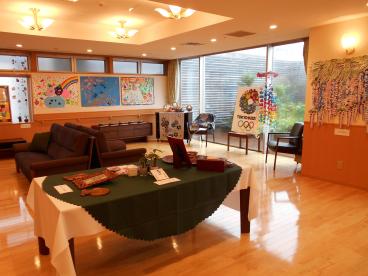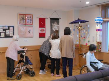日頃のレクリエーションで作成して頂いたフロア共同作品・居室で日々コツコツと作られたり、ご入居前に作られたり等の個人作品を展示いたしました。