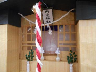 段ボールの確保から始め、各部署でパーツを作り組み合わせ、模様を張り、小道具を作り、、、様々な工程をすべて職員が手作りをして、4階の食堂に大きくて本物そっくりな素晴らしい『野毛神社』が出来上がりました!!