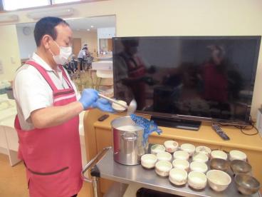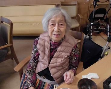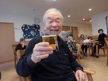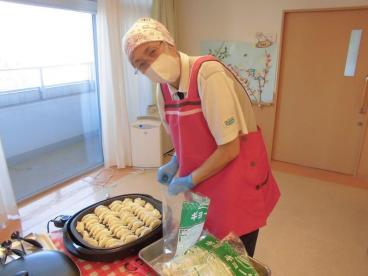 「免疫力アップおやつで心も体もほっかほか!」ということで、“焼きたて餃子”と“とろ~りチーズのピザパン”の他、甘酒・ホット梅酒・スパークリングワイン等の飲み物を用意し、おやつレクリエーションを行いました。