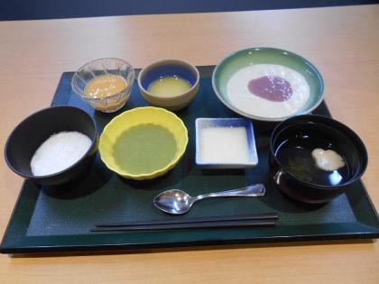 本日のメニューは、左手前からすべら粥、白菜と春菊のお浸し、とろみのお吸い物、豚肉となすの塩バターレモンソースがけ、さつまいものオレンジ煮、フルーツカクテルです。