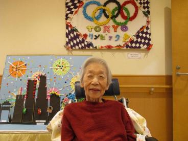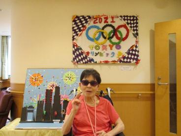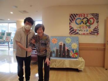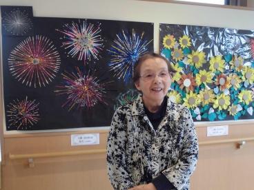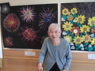 日々のレクリエーションで、一生懸命作成してくださった作品をバックに記念撮影。