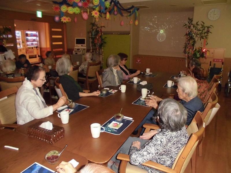 前回掲載された七夕会とは、違う日のご様子です。短冊に書かれたお願い事の発表をしてもらったり、七夕の歌を合唱したりと、会を楽しんでいただくようにと考え、この日を迎えました。