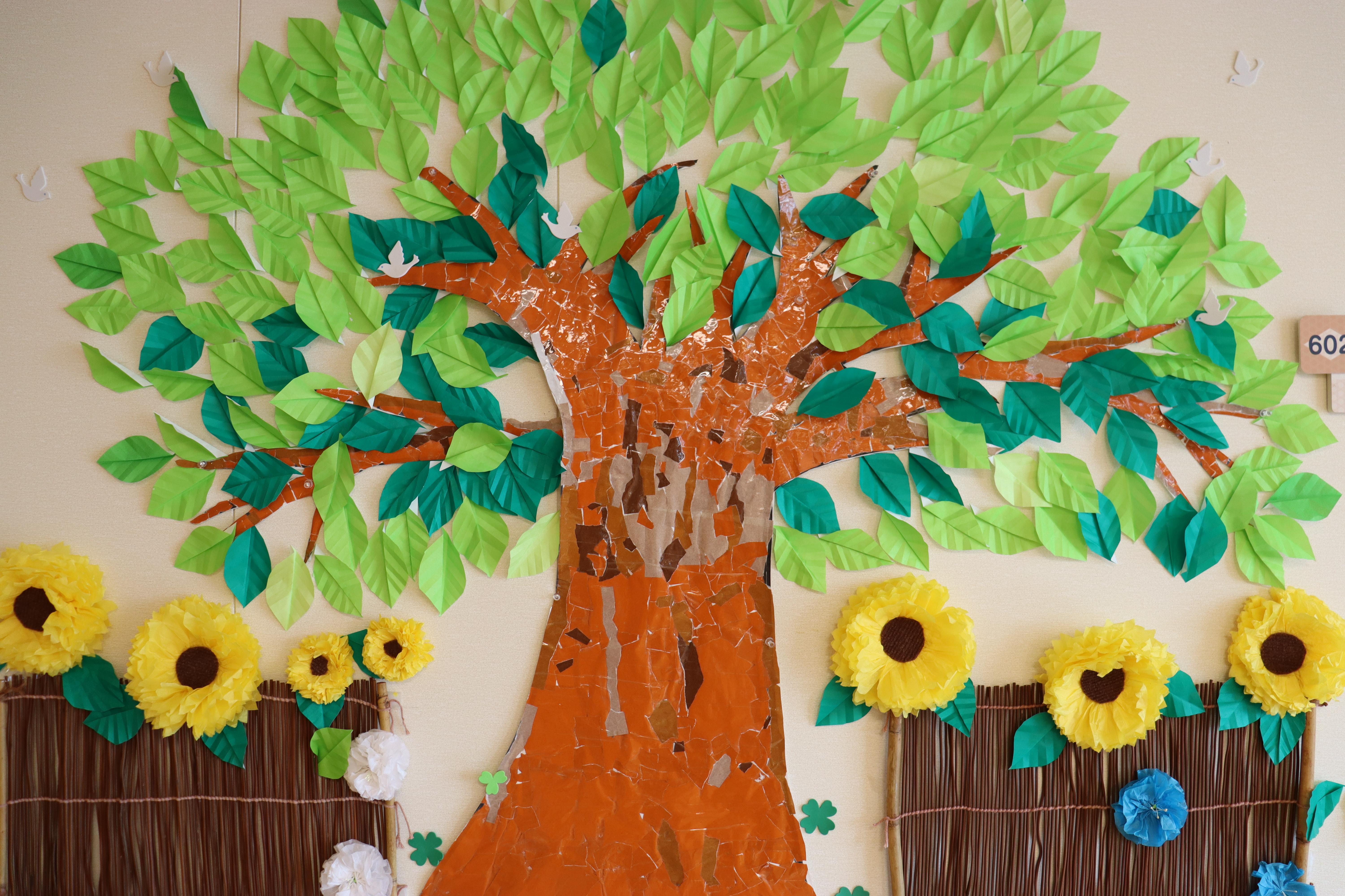 毎月、季節ごとに、折り紙を使って作品を作られています。8月の作品のお題目は、ズバリ「ひまわり」です。また、壁にはお客様が作られた大きな木がございます。春には桜が満開でしたが、こちらも夏ぴったり、「ひまわり」が満開に咲いています。