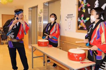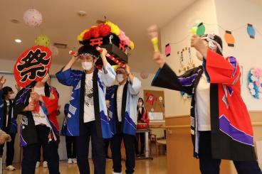 続けて、お御輿隊が手作りのお御輿を勢いよく上下させ、談話室やお客様の居室を回ります。