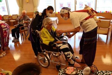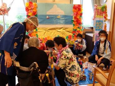 アロハシャツを着た職員が、トロピカルムードでお出迎え。