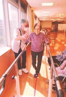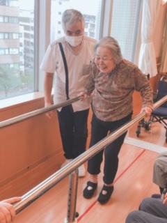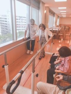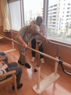 訓練し始めたころは、訓練指導員の声かけに1歩1歩進むことが可能であったお客様も、「今では後ろ向きでも1本線の上歩けますよ!」とスムーズに行うことが出来るようになります。