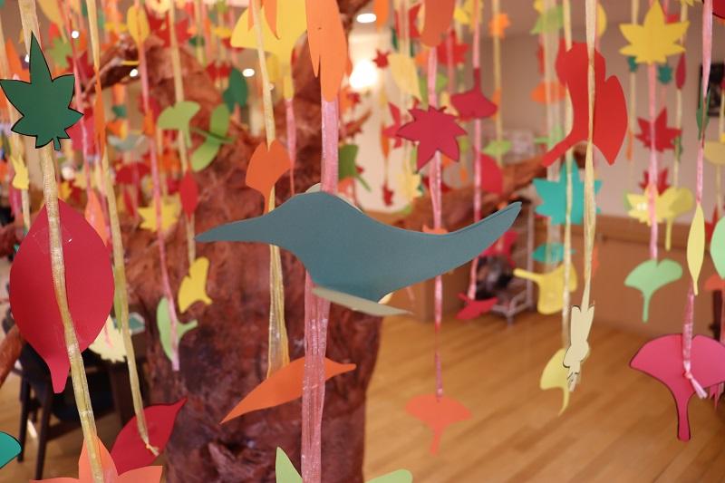 先日飾付けした紅葉の木に、ハチドリ・カラス・案山子が加わりました。カラフルなハチドリは、紅葉と相まって癒しの空間を作っています。カラス除けの案山子は、夜遅くに見てもお客様が驚かないように、『へのへのもへじ』の可愛いおじさん風にしてみました。
