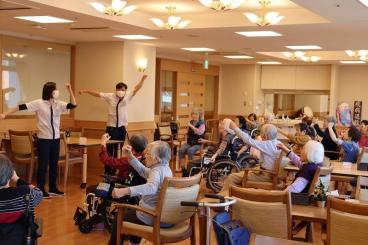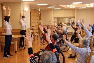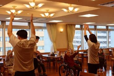 昨年の2月よりご入居頂いているフロアごとに、少人数ずつで行なっておりました体操を、2フロア合同で行うことになりました。