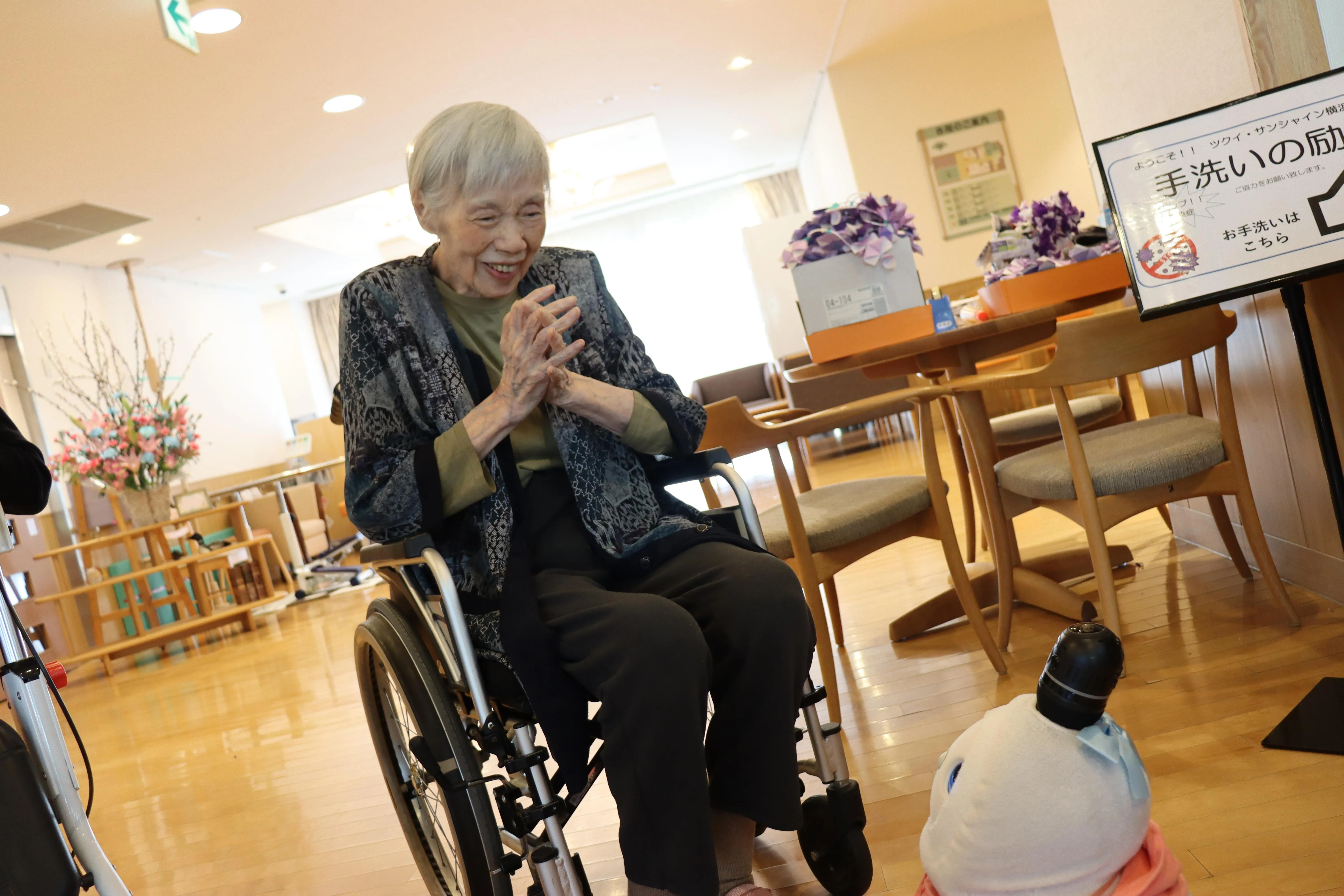 施設のロビーを彩ってくれているお花屋さんに、癒やしロボットのまるちゃんとおこめちゃんがいました。