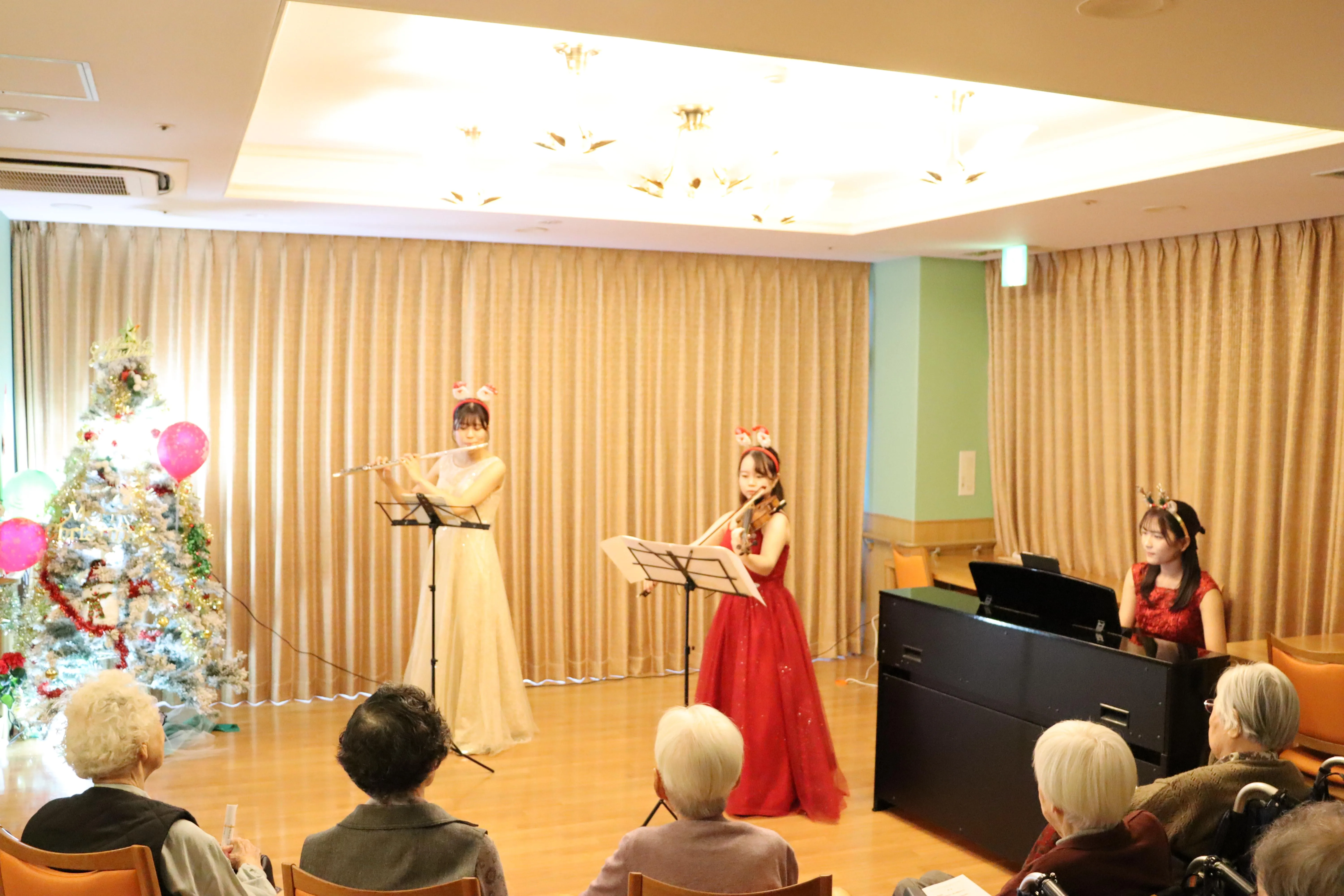 演奏者の衣装が白色と赤色のドレスで、クリスマスに合っていて綺麗でした!!