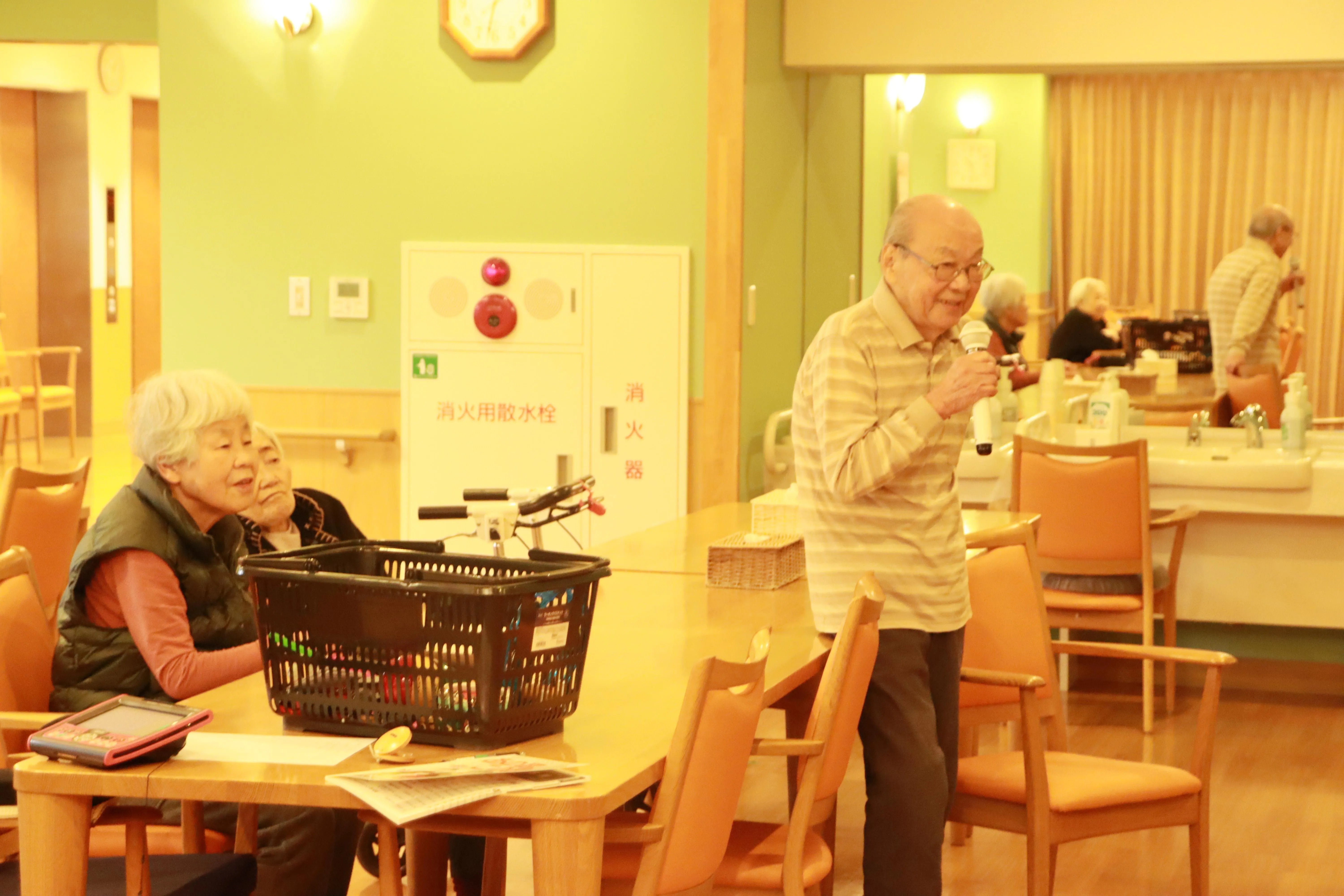 早速皆様から「やりましょう」と声がかかり、カラオケを1階食堂で行いました。