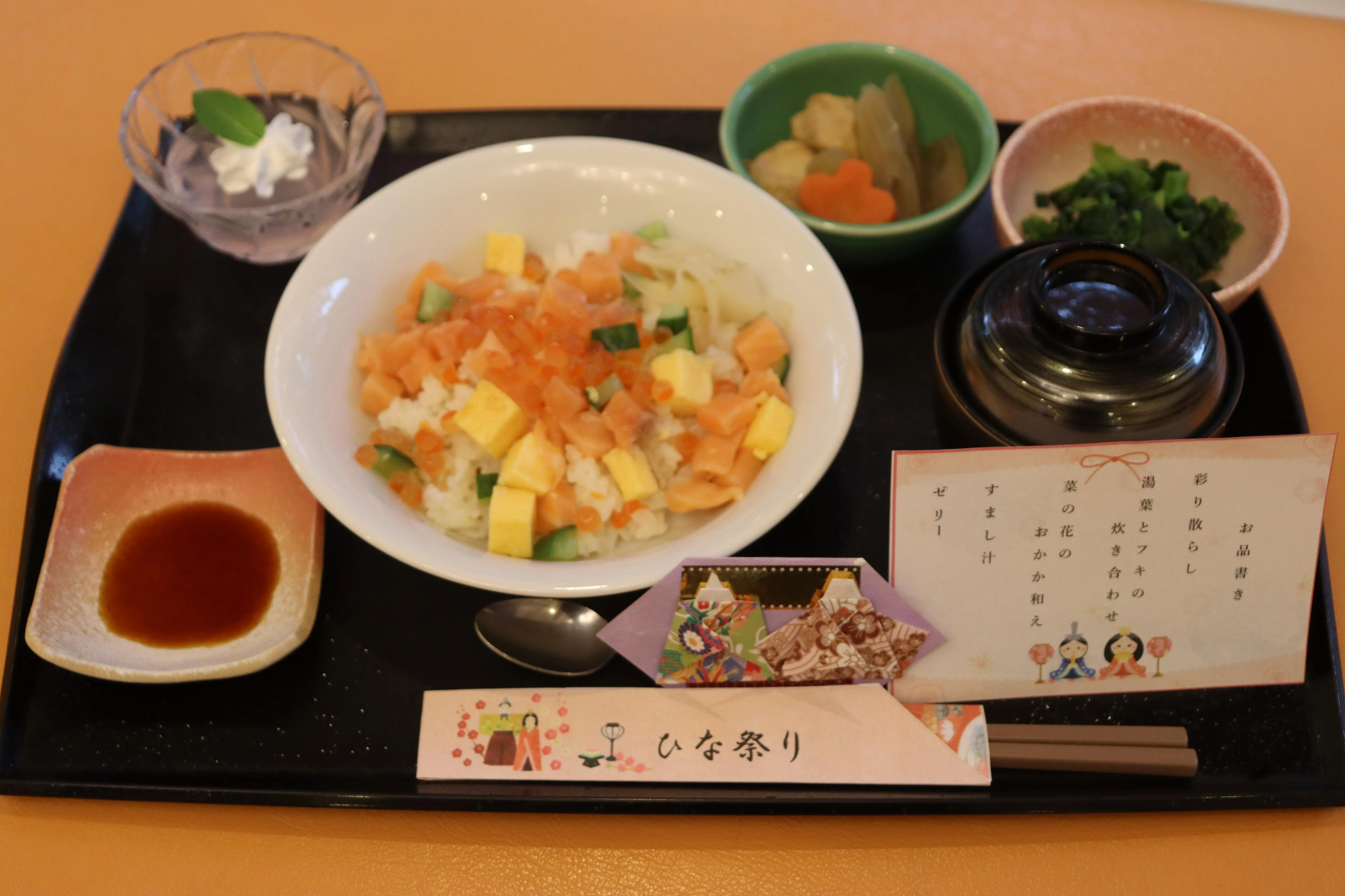 3月3日の雛祭りに、ちらし寿司を提供しました。お品書きは彩りちらし、湯葉とフキの炊き合わせ、菜の花のおかか和え、すまし汁、ゼリー色とりどりでございます。