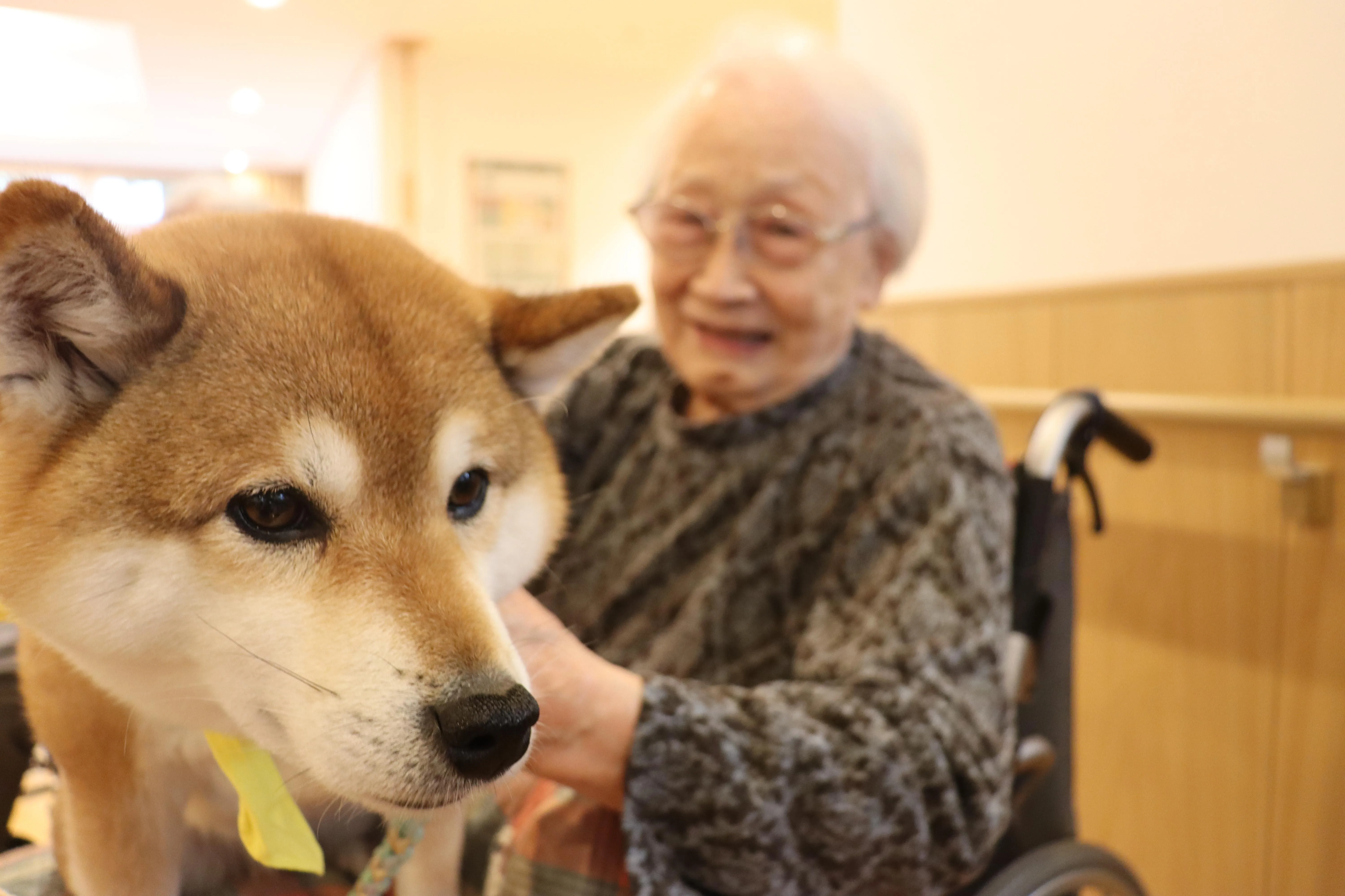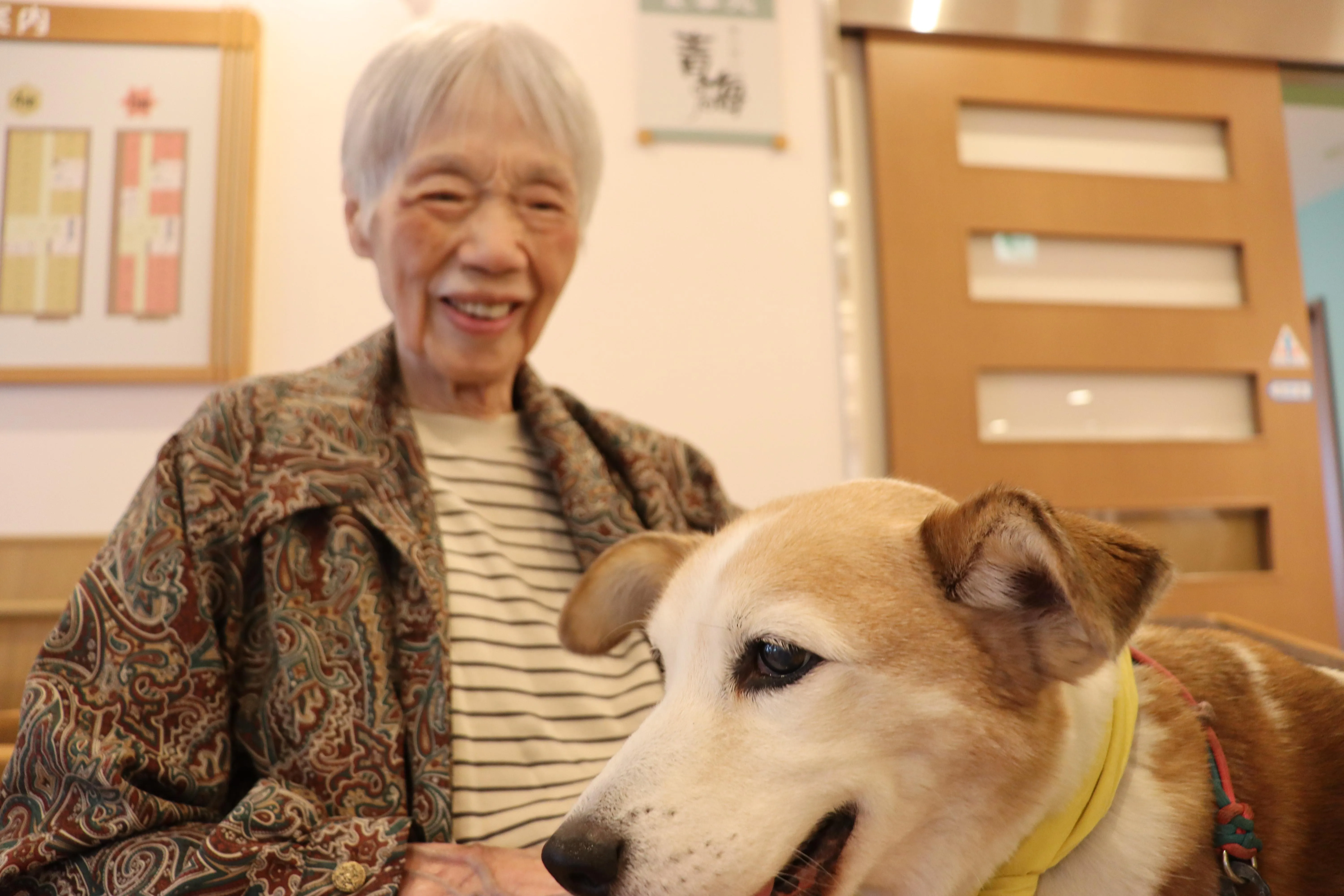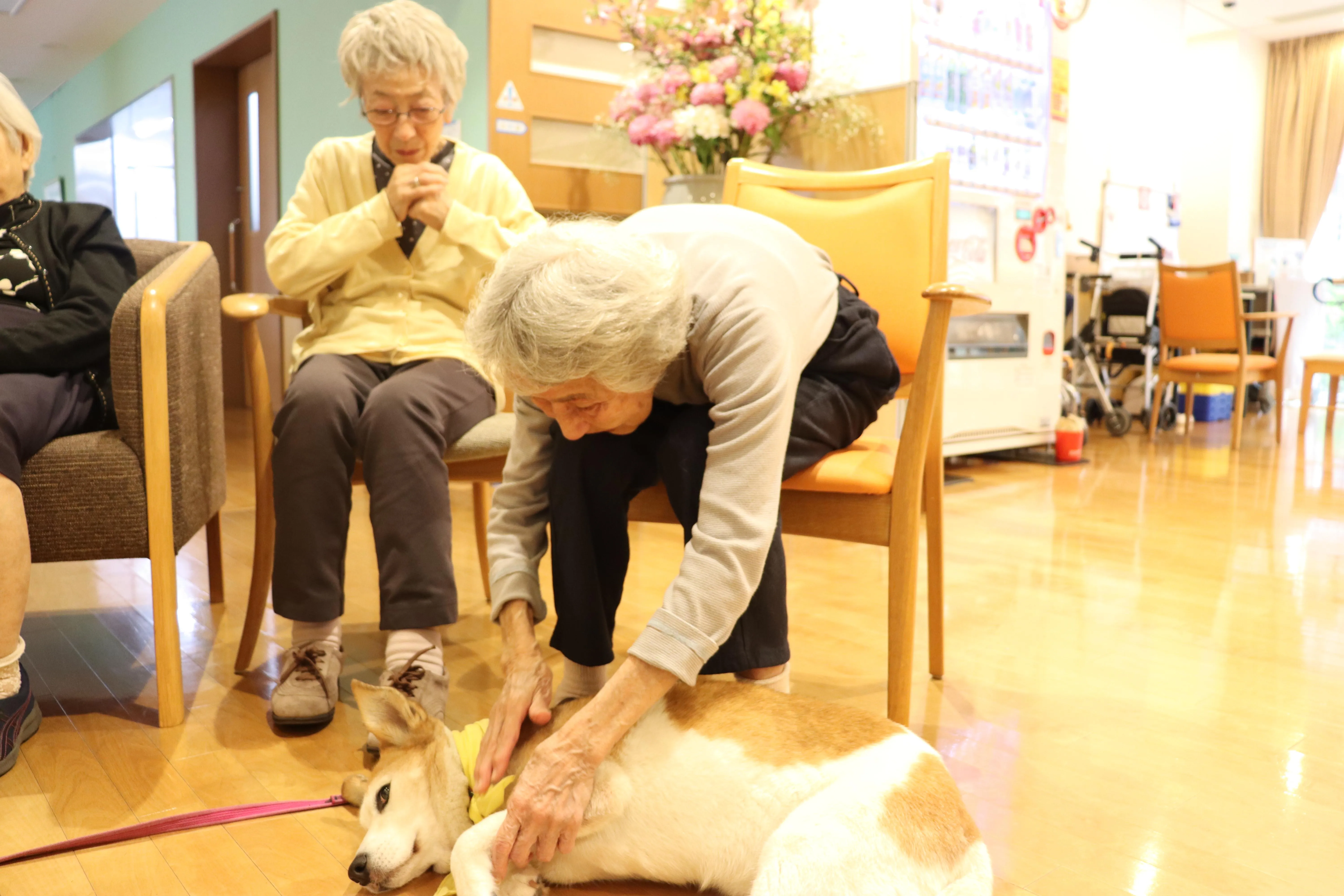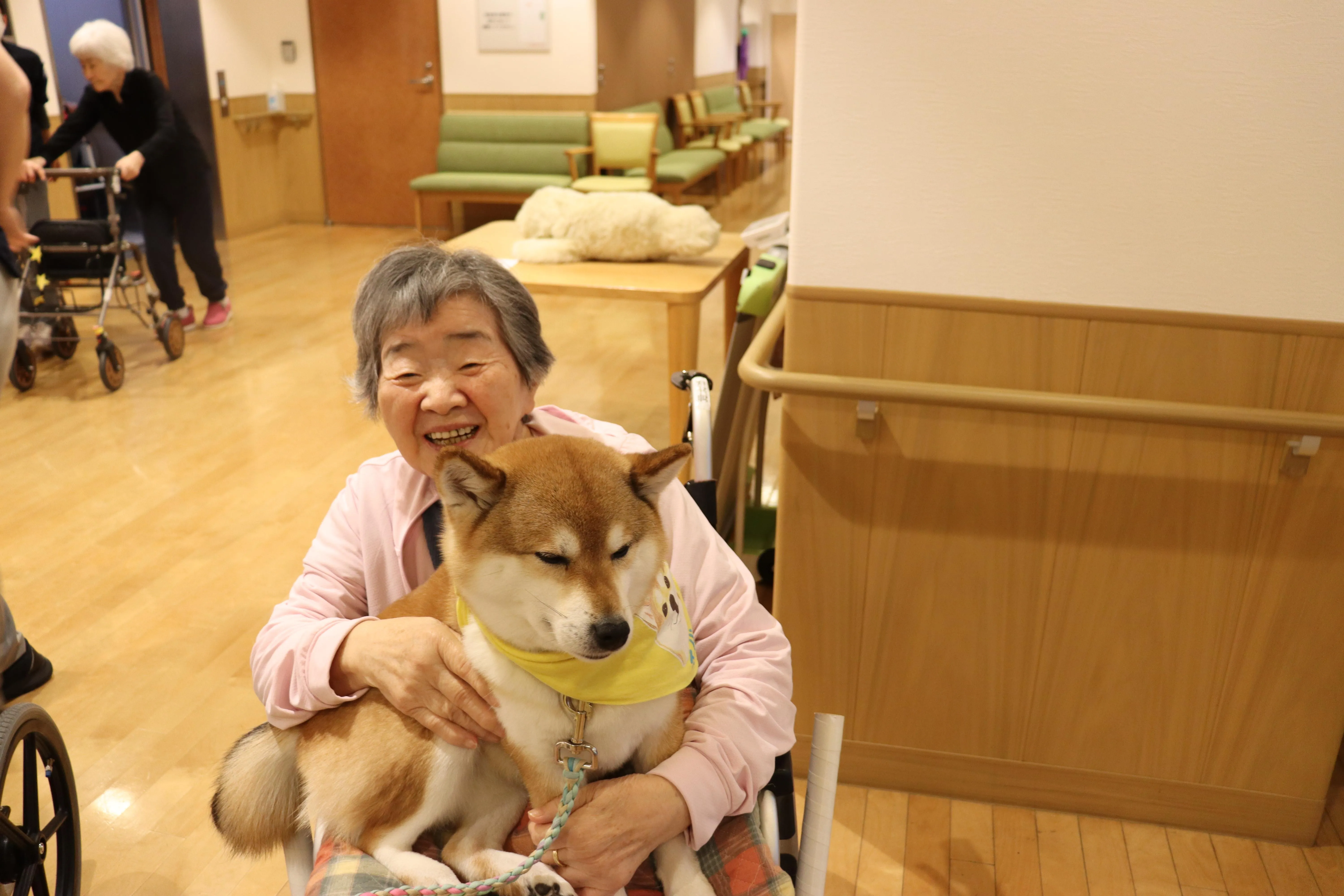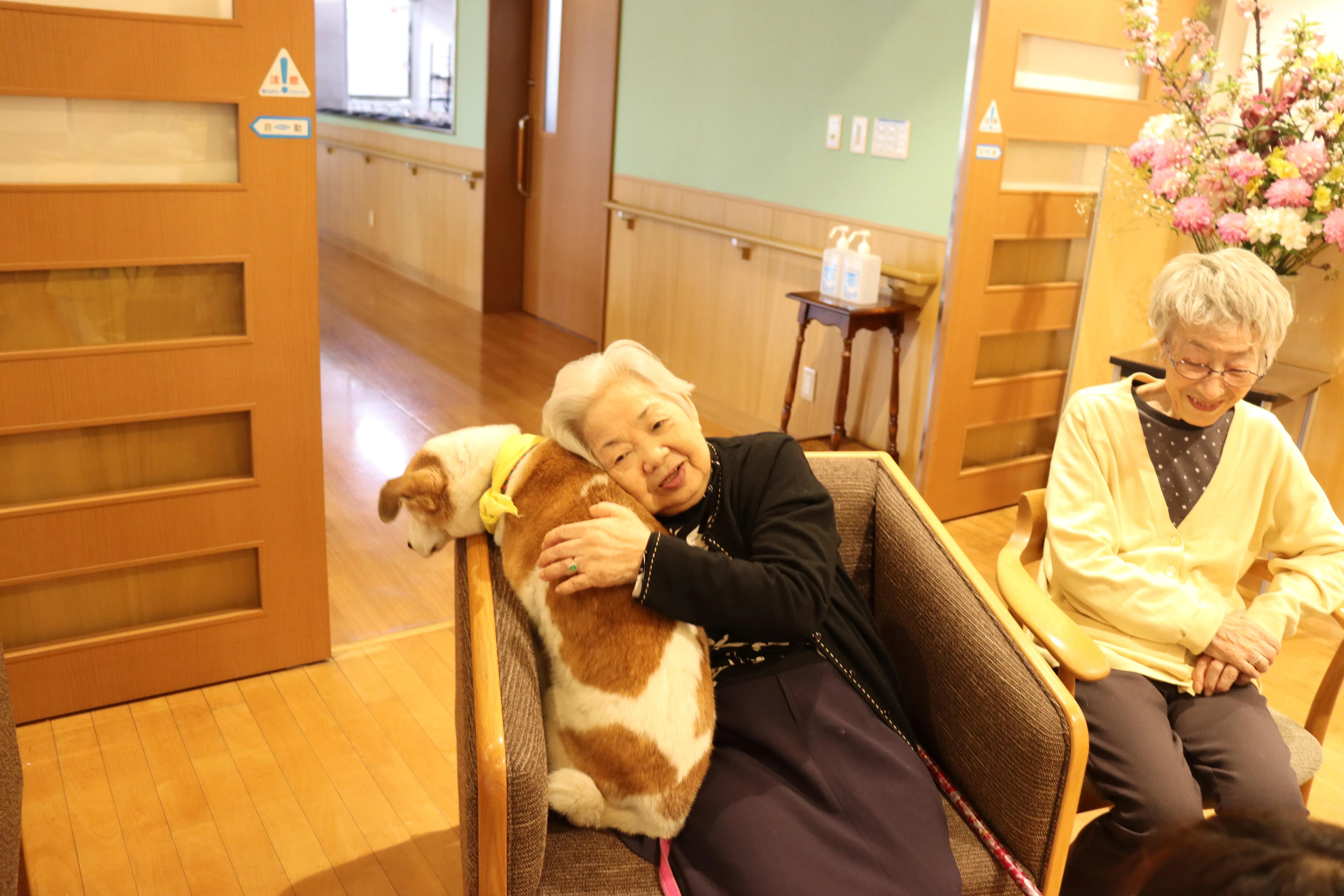今月も2匹のワンちゃんたちが、ドッグセラピーとして来てくれました。動物好きのお客様も多く、ワンちゃんたちが来るのを楽しみにされています。自宅でペットを飼っていた頃を思い出されたり、スキンシップを取ることで、脳の活性化が期待できます。