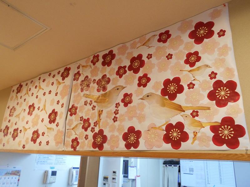 ものつくりレクリエーションで作成した、「梅とウグイス」の作品が完成しました!食堂と受付カウンターの壁に、飾らせていただきましたよ~