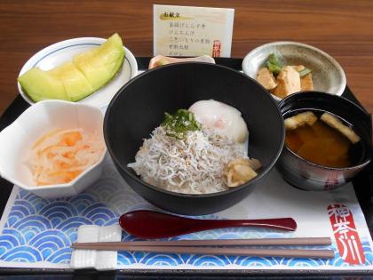 ・釜揚げしらす丼 ・けんちん汁 ・三色いなりの煮物 ・甘酢大根 ・メロン