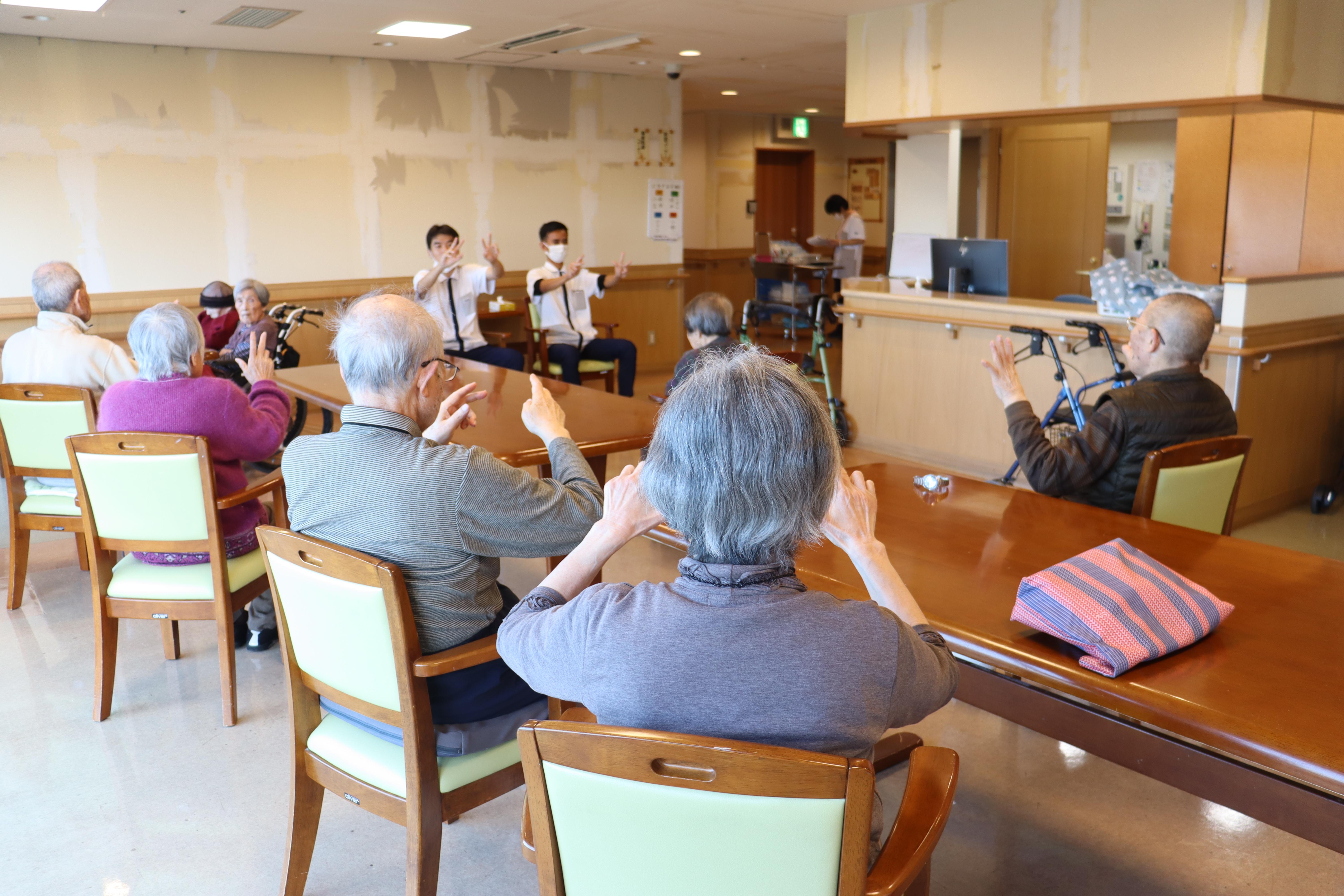 朝のラジオ体操、全身調整体操の様子です。椅子に座って無理なく出来る範囲で参加していただいています。スタッフの声掛けでお客様も真似をしながら身体を動かしています。