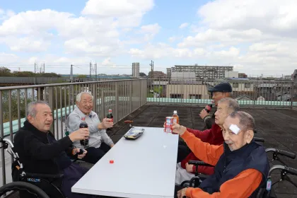 フロアが違う男性のお客様、入居したばかりの男性のお客様5名で、出身地話しや普段食堂では話せないお身体のお話し等、情報交換されていました。