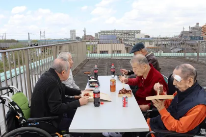 お天気に恵まれた今日、桜や菜の花が見える屋上で、少人数での青空お花見ランチ会を開催しました。近所のファミリーレストランからお好きな飲み物とお弁当を注文し、召し上がって頂きました。