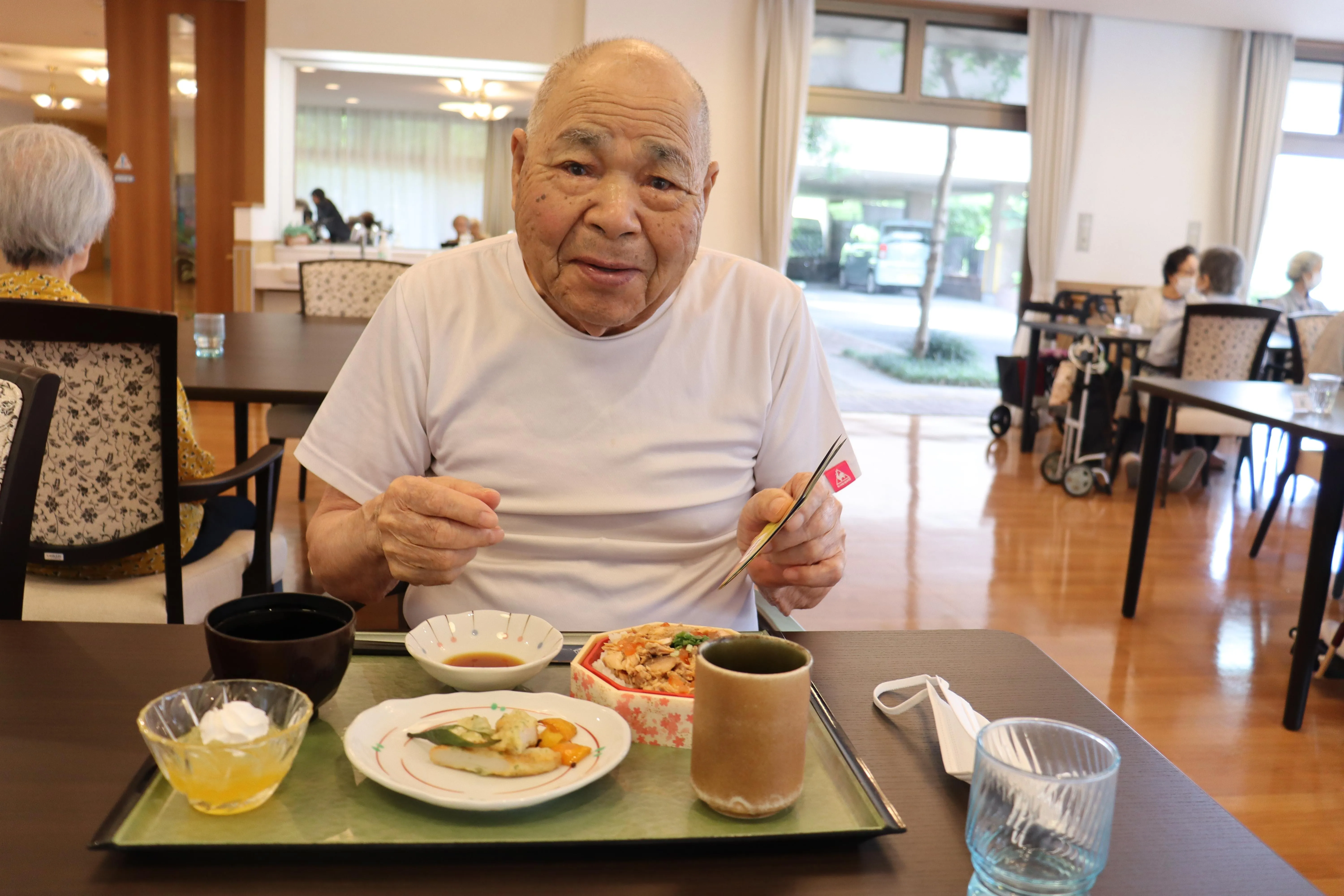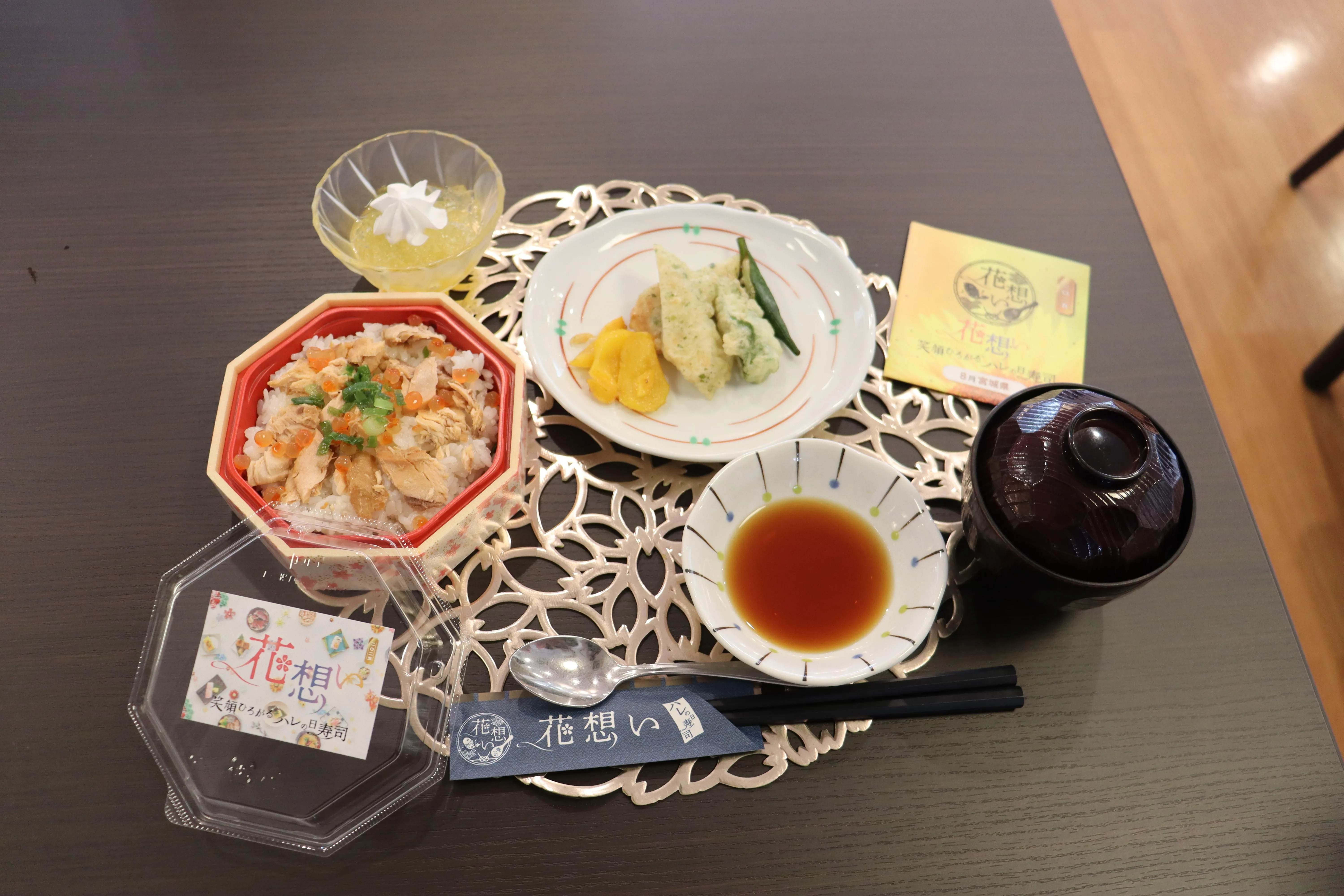 本日の昼食は、イベント食~笑顔ひろがるハレの日寿司~として、宮城県の郷土料理はらこ飯・笹かまぼこ天ぷら弁当を提供させて頂きました。デザートには、この夏の時期に綺麗に咲いている向日葵色のレモンゼリーで、さっぱり喜んで頂きました。