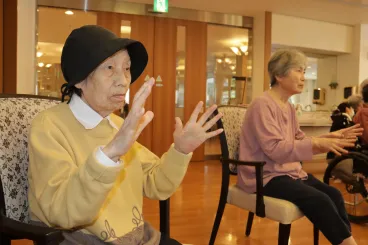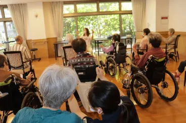 本日は、ヨガインストラクターの先生をお呼びしての椅子ヨガレクリエーション日でした。運動機能低下予防にも繋がるヨガには、定期的に参加されているお客様も大勢いらっしゃいます。呼吸法を意識しての心と身体のリフレッシュtime。初めて参加されたお客様からは、呼吸法について先生にご質問もあり、先生からは分かりやすく説明して頂きました。