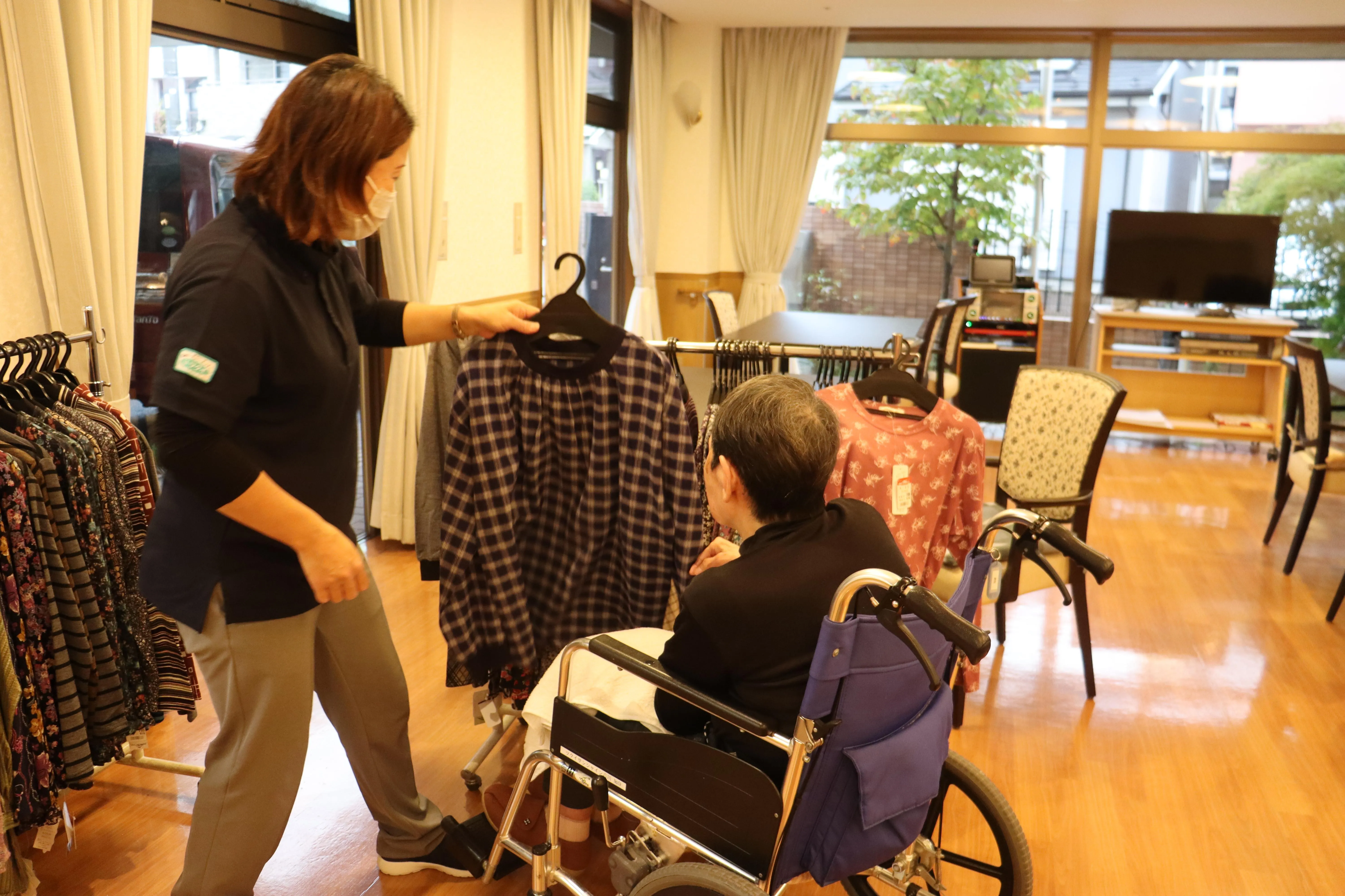毎月恒例の移動販売日です。近所のお店屋さんに来て頂き、食堂が売店に変わります。衣類や消耗品、おやつ等皆様に選んで頂いています。時にはスタッフが店員さんになり、一緒に選んだりもします。