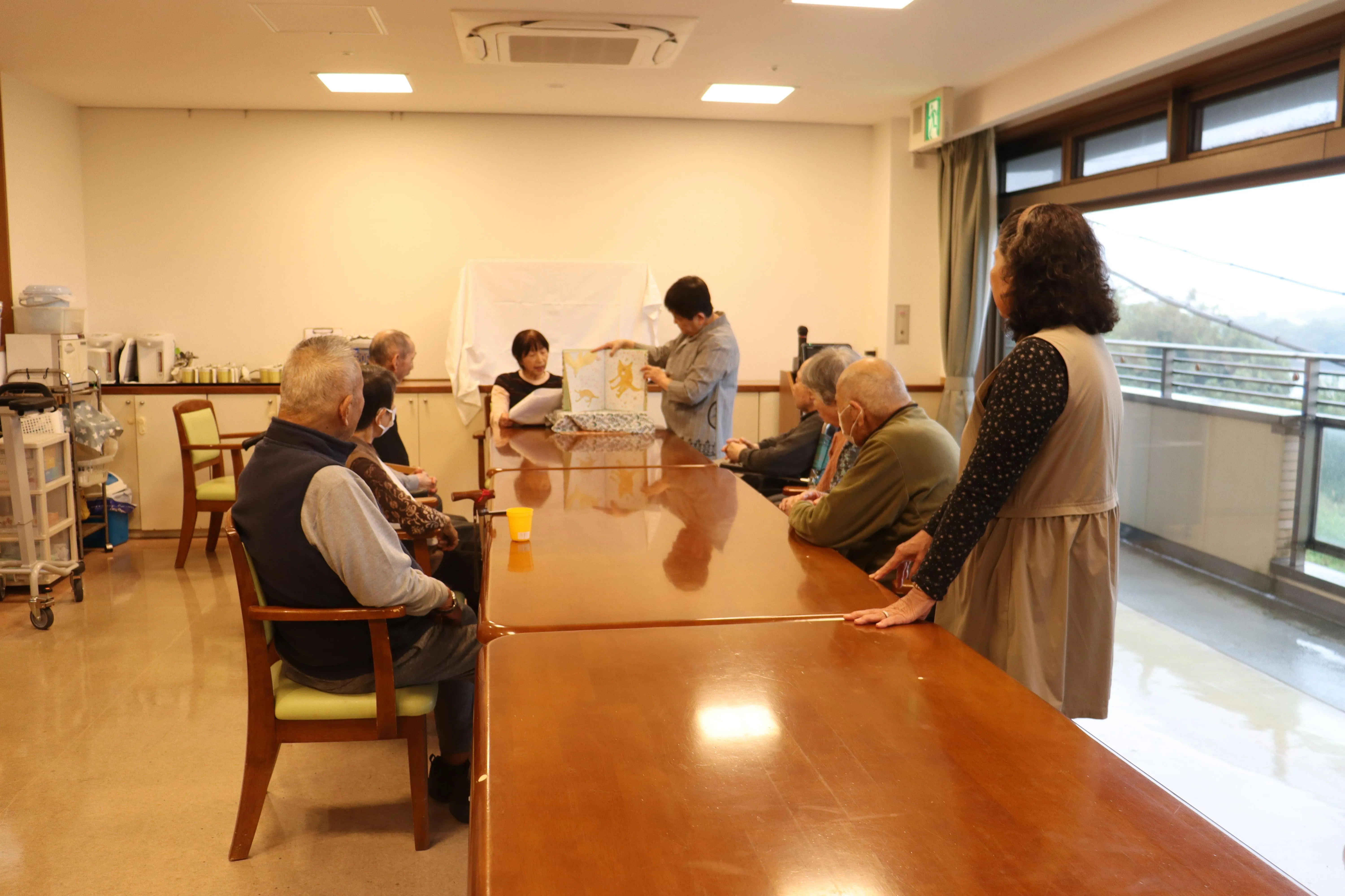 ボランティアさんによる絵本【きつねの木】の読み聞かせと、歌のレクリエーション開催。絵本に集中した後は、お客様の大好きな歌謡曲や季節の歌で楽しみました。