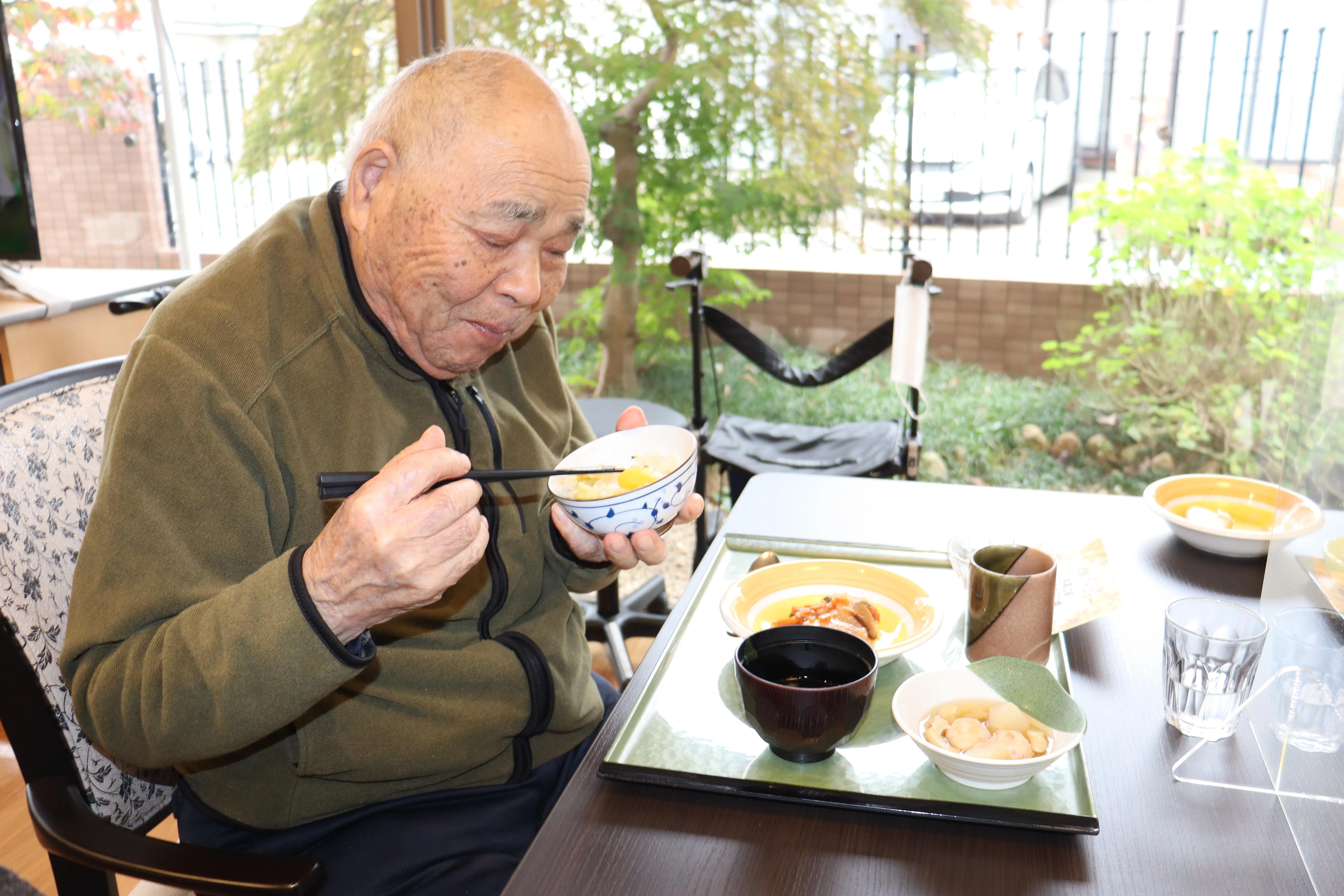 本日の昼食は季節のメニューとなっており、芋栗ご飯、鶏肉のきのこ焼き、大根のおでん風など、秋を感じる食材と寒い季節に食べたくなるメニューを提供させて頂きました。「栗ご飯うまかったなあ」「秋を感じるわね」と喜びの感想をたくさん頂きました。