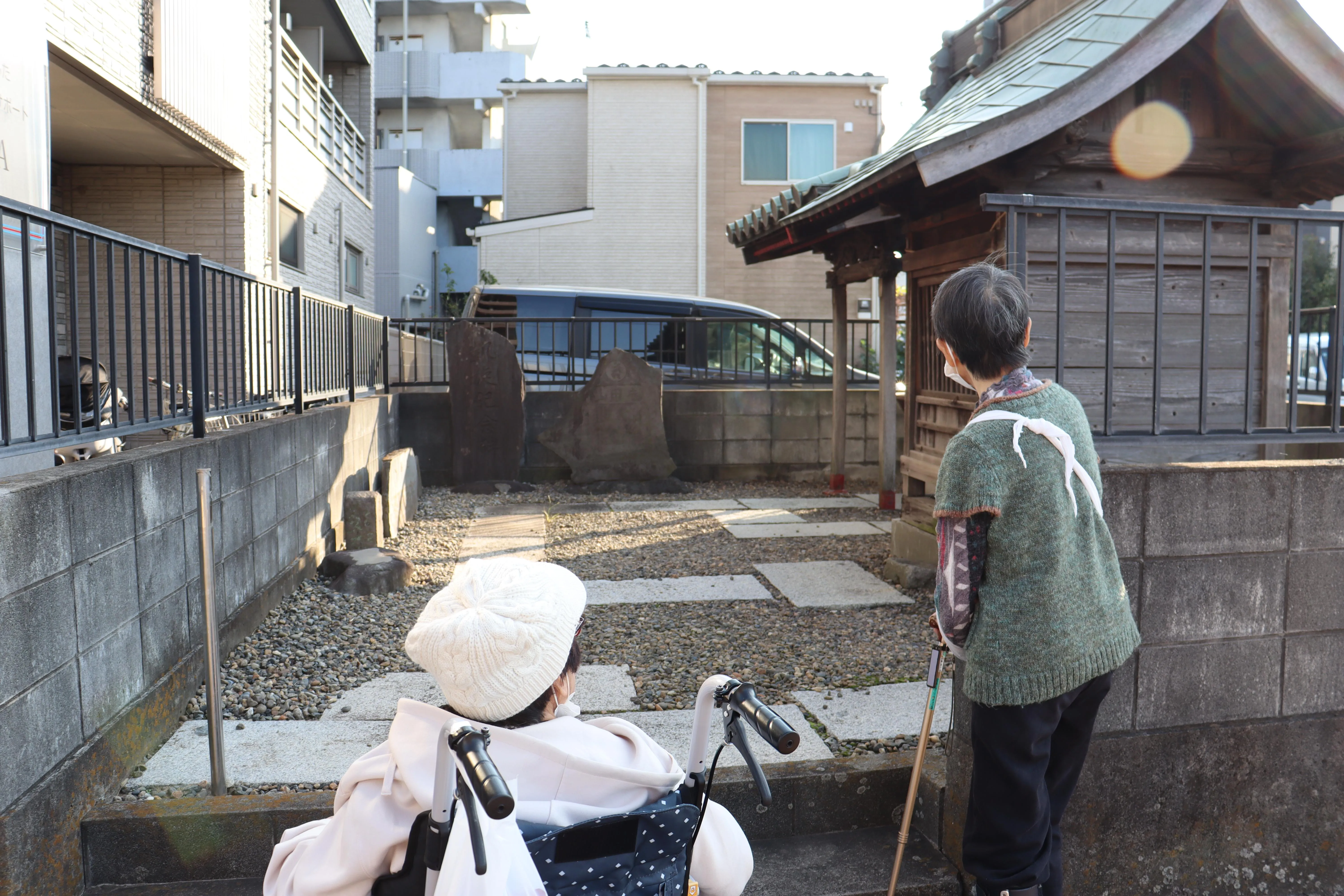 お天気が良かったので外を眺めていたお客様に声を掛け、近所にお散歩に出掛けました。神社に立ち寄ったり、セブンイレブンでおやつを購入したり、疲れたら少し座って休んだり…午後のお散歩をゆっくり楽しんで来ました。
