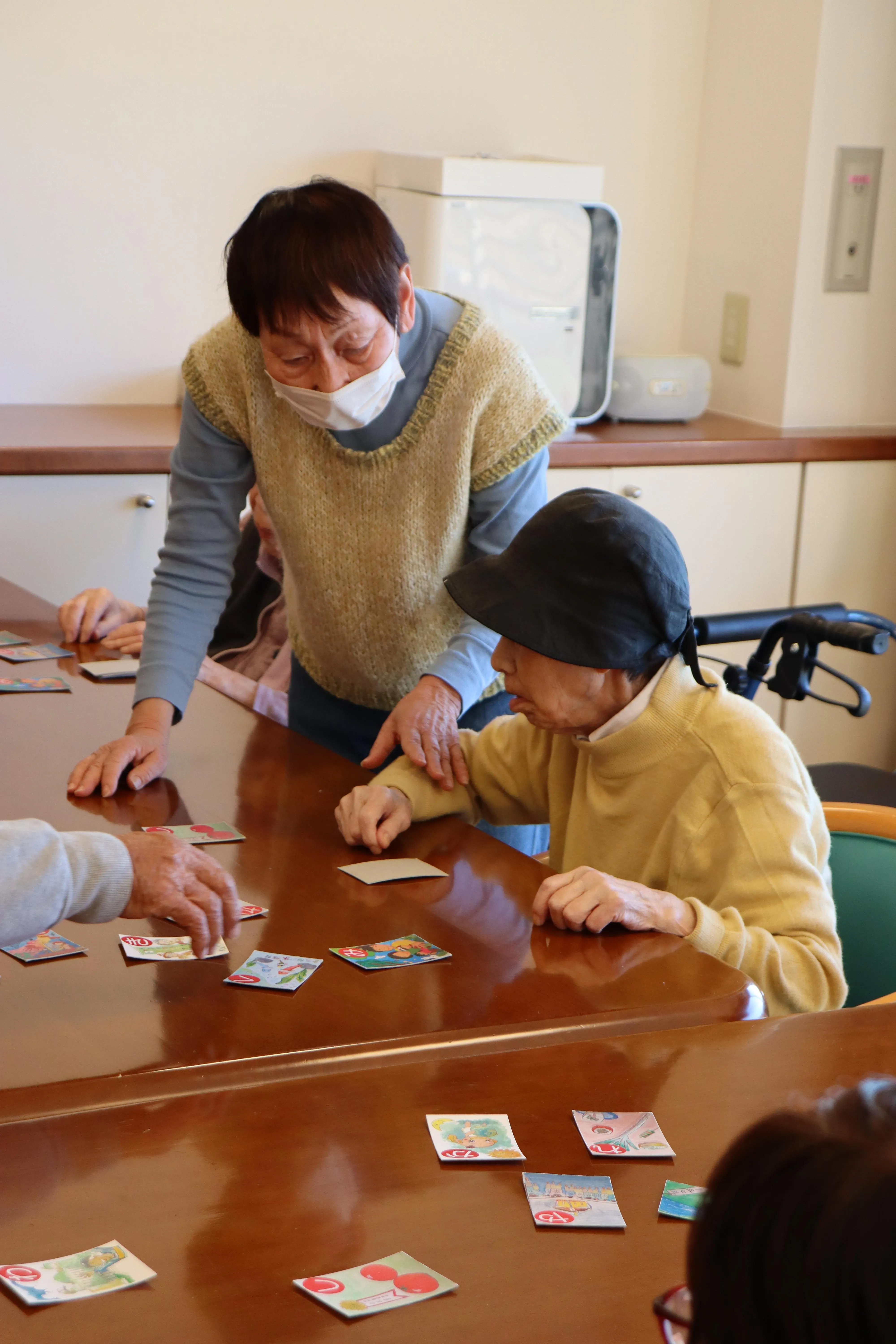 ボランティアさん手作りのかるたでかるたとり大会レクレーション開催。スタッフも一緒に楽しませていただきました。文字ではなく絵で当てているお客様もいらっしゃいました。かるたボランティアさんには毎月第1火曜日に来ていただいております。