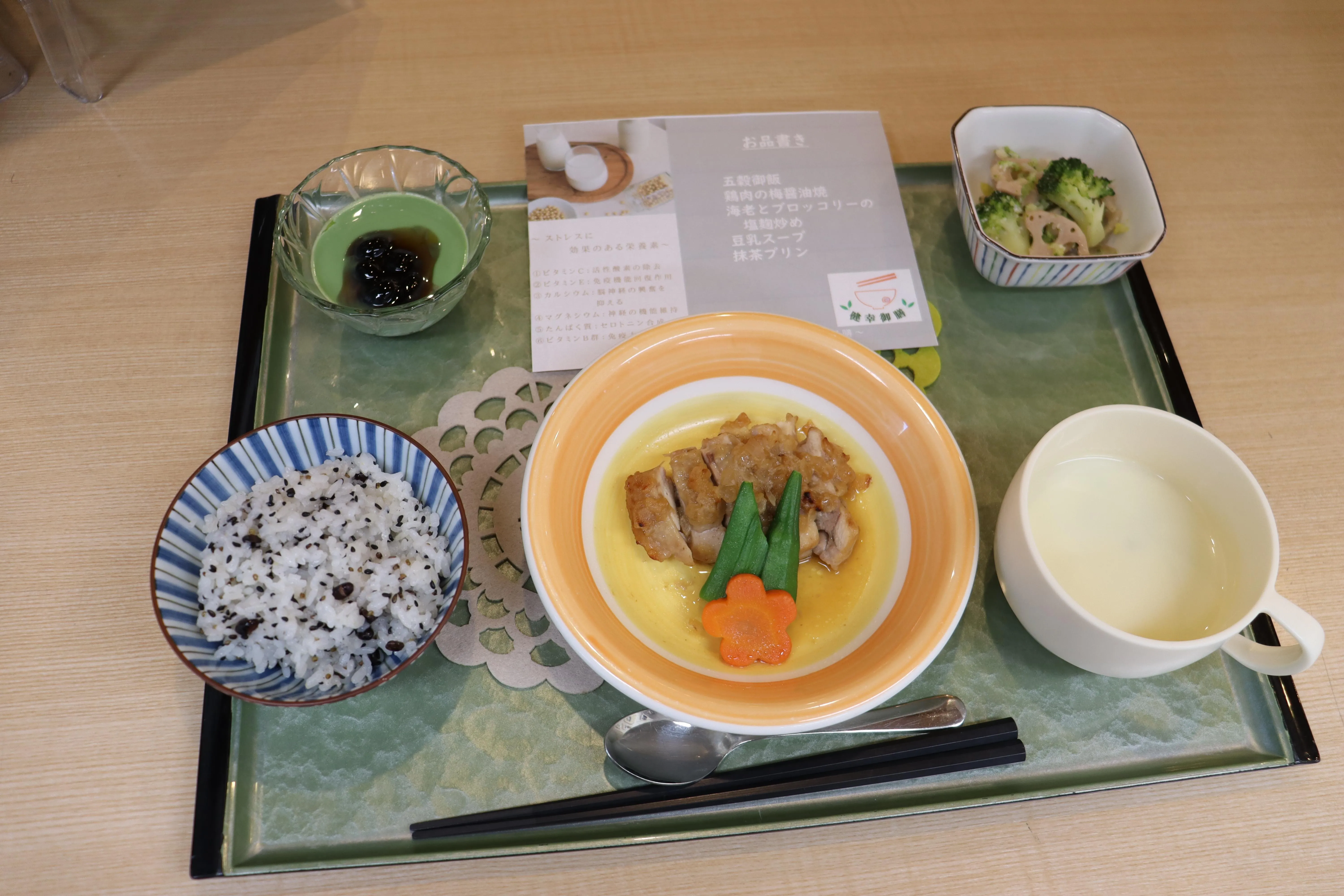 本日はイベント食【健幸御膳】ランチでした。五穀米ご飯、梅を使った鶏肉料理、豆乳スープ、デザートには抹茶プリンをご用意し、健やかに幸せになって頂くメニューを提供させて頂きました。女性のお客様には大好評でした。