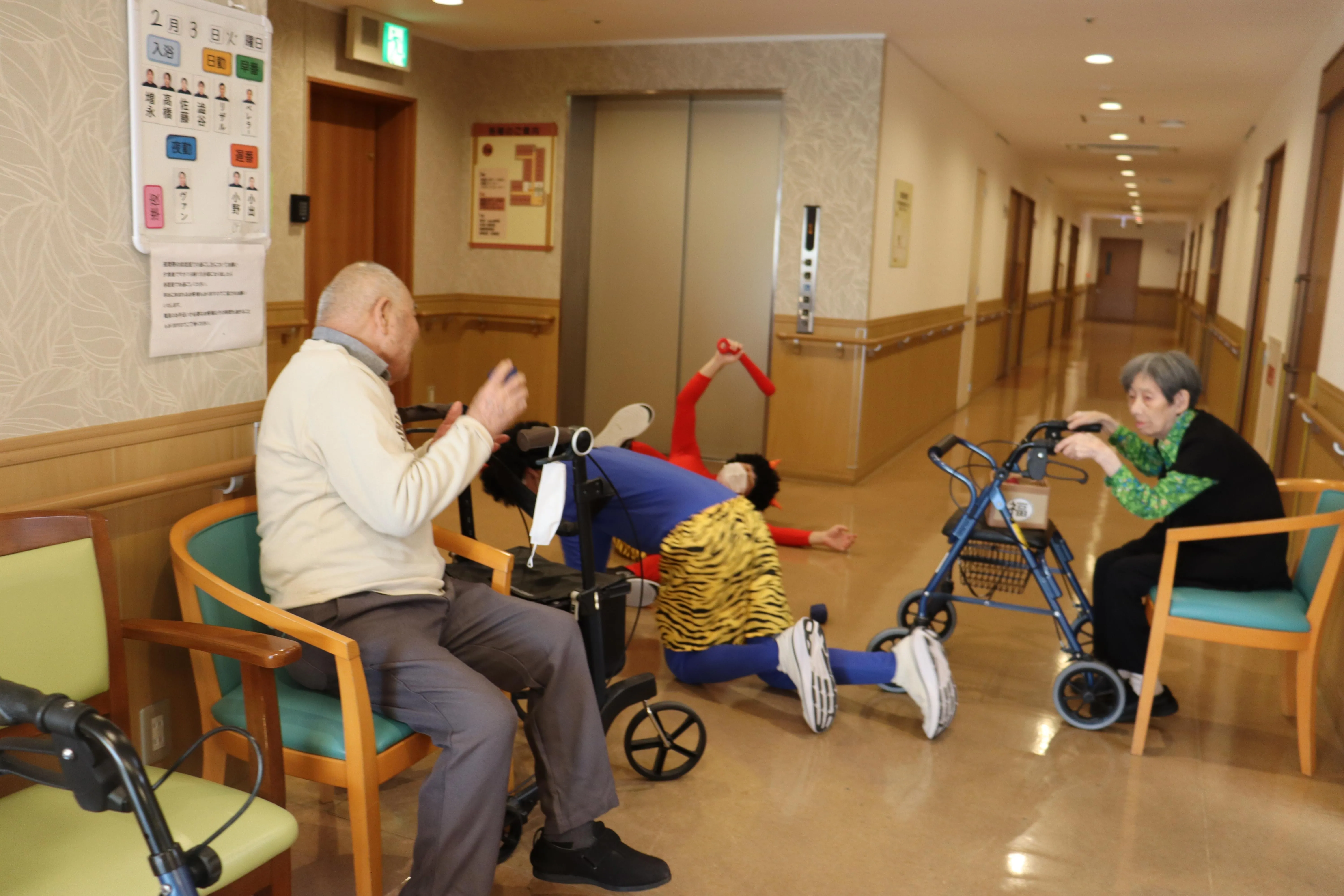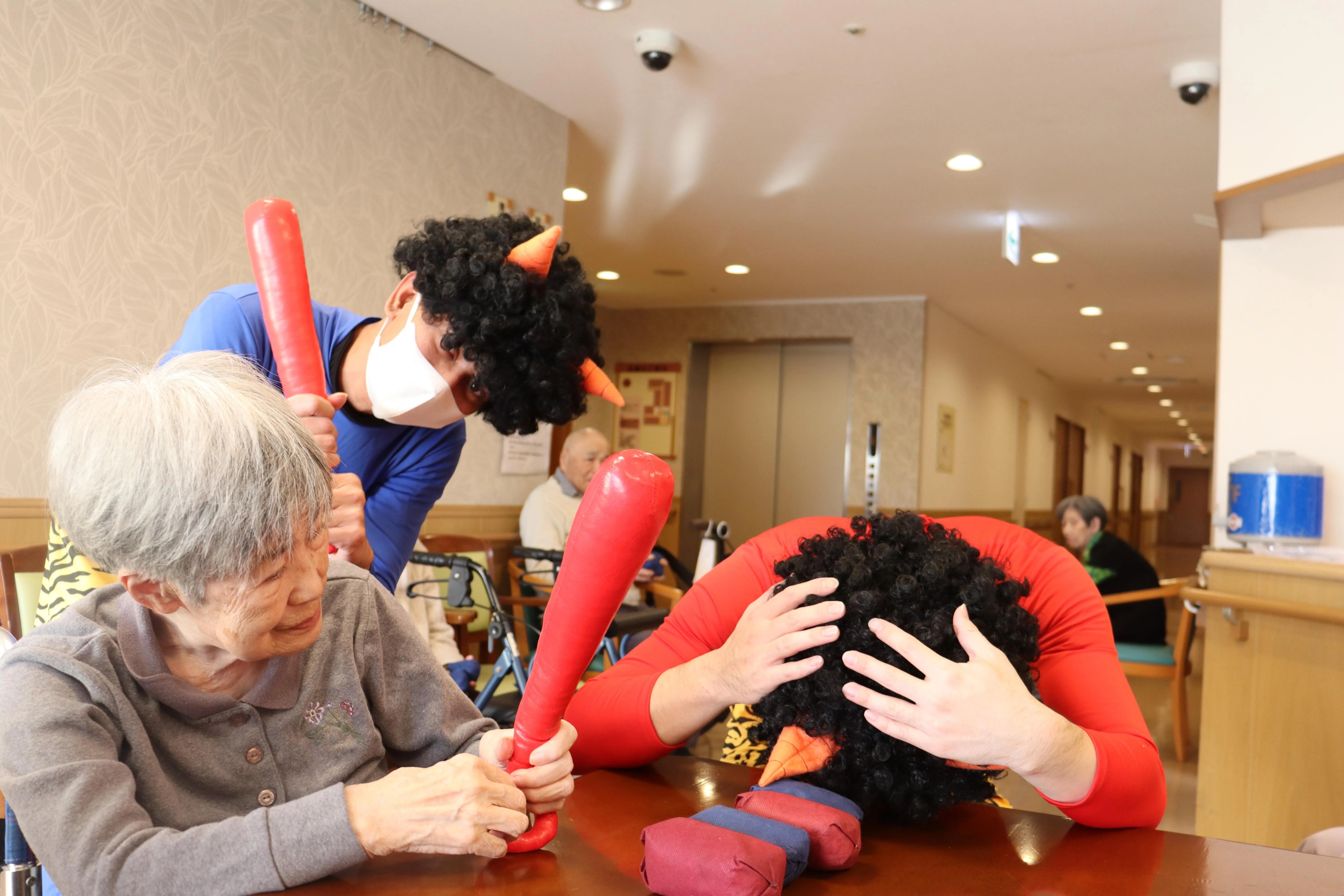 節分の今日、赤鬼と青鬼が現れお客様に鬼退治をお願いしました。鬼退治の後は鬼達と仲良くなりました。