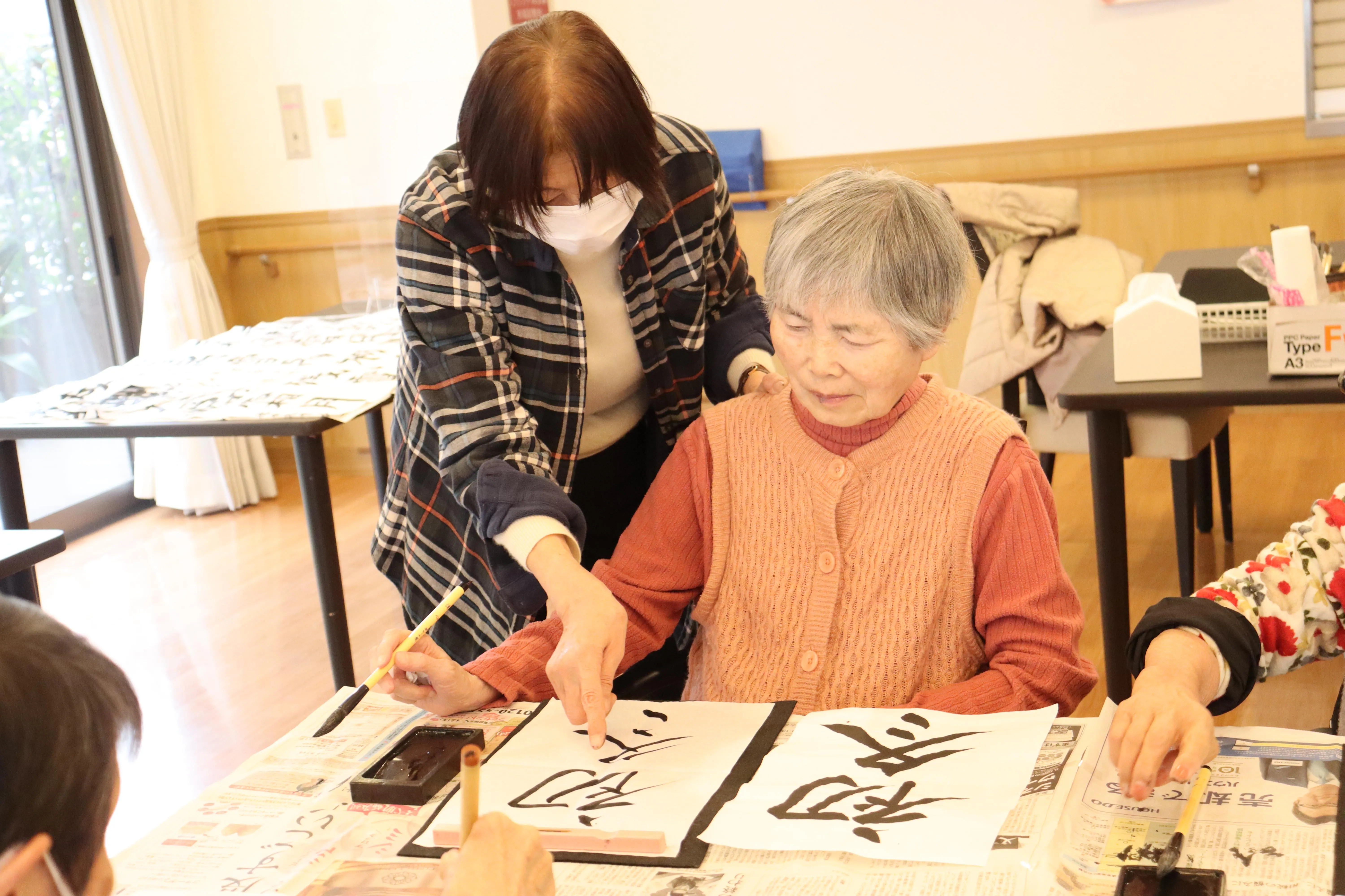 毎月恒例のボランティアさん主催の書道レクレーション日です。筆の動かし方、文字のバランス等丁寧にご指導頂きながら仕上げていきます。書道だけではなく他愛もない会話もお客様にとっては楽しい時間です。