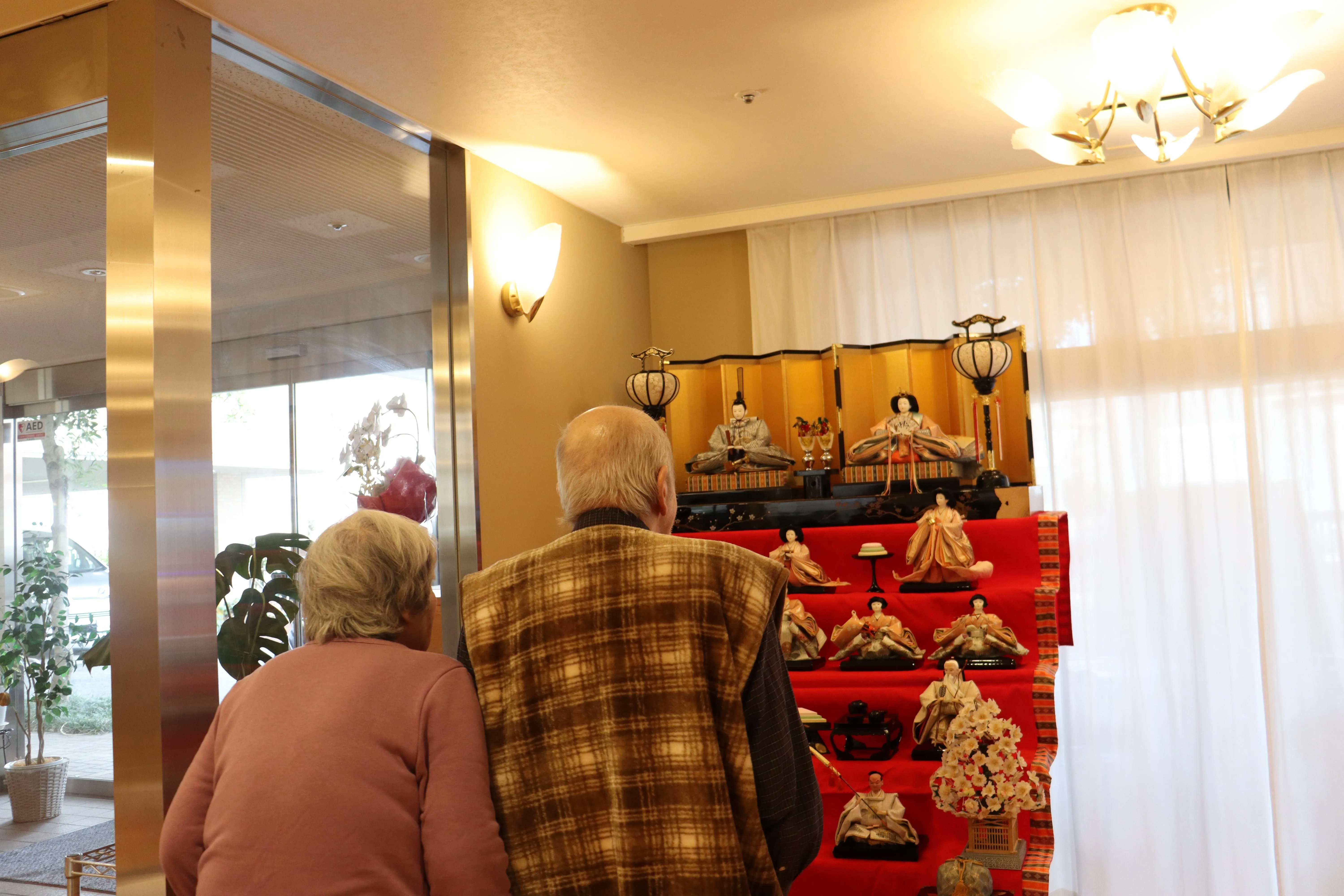 毎年お褒めのお言葉を頂く雛飾り。今年もエントランスホールに登場です。食堂の行き来で目にする雛飾りに、お客様は足を止め見惚れています。