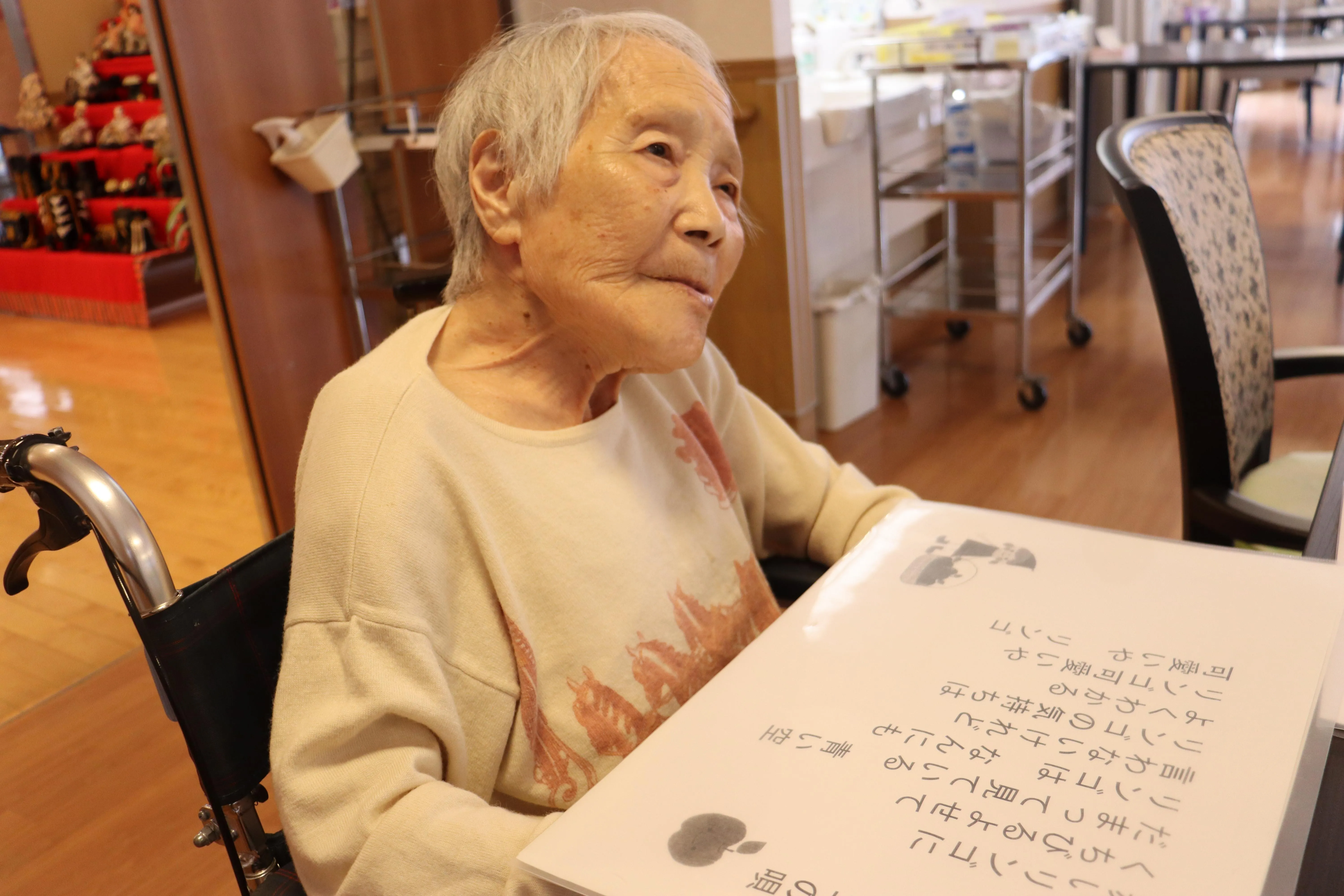 昼食前の口腔体操と、今月の歌の時間です。本日は「リンゴの唄」でした。歌詞カードを見ながら、若い時によく召し上がったリンゴのお話しを聞かせて頂きました。