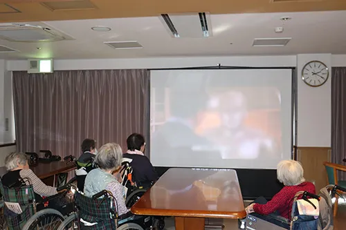 毎月恒例の映画観賞会です。映画館のようにライトを消しスタート!長めの洋画でしたので、おやつを召し上がって頂きながら、ゆっくり観賞して頂きました。