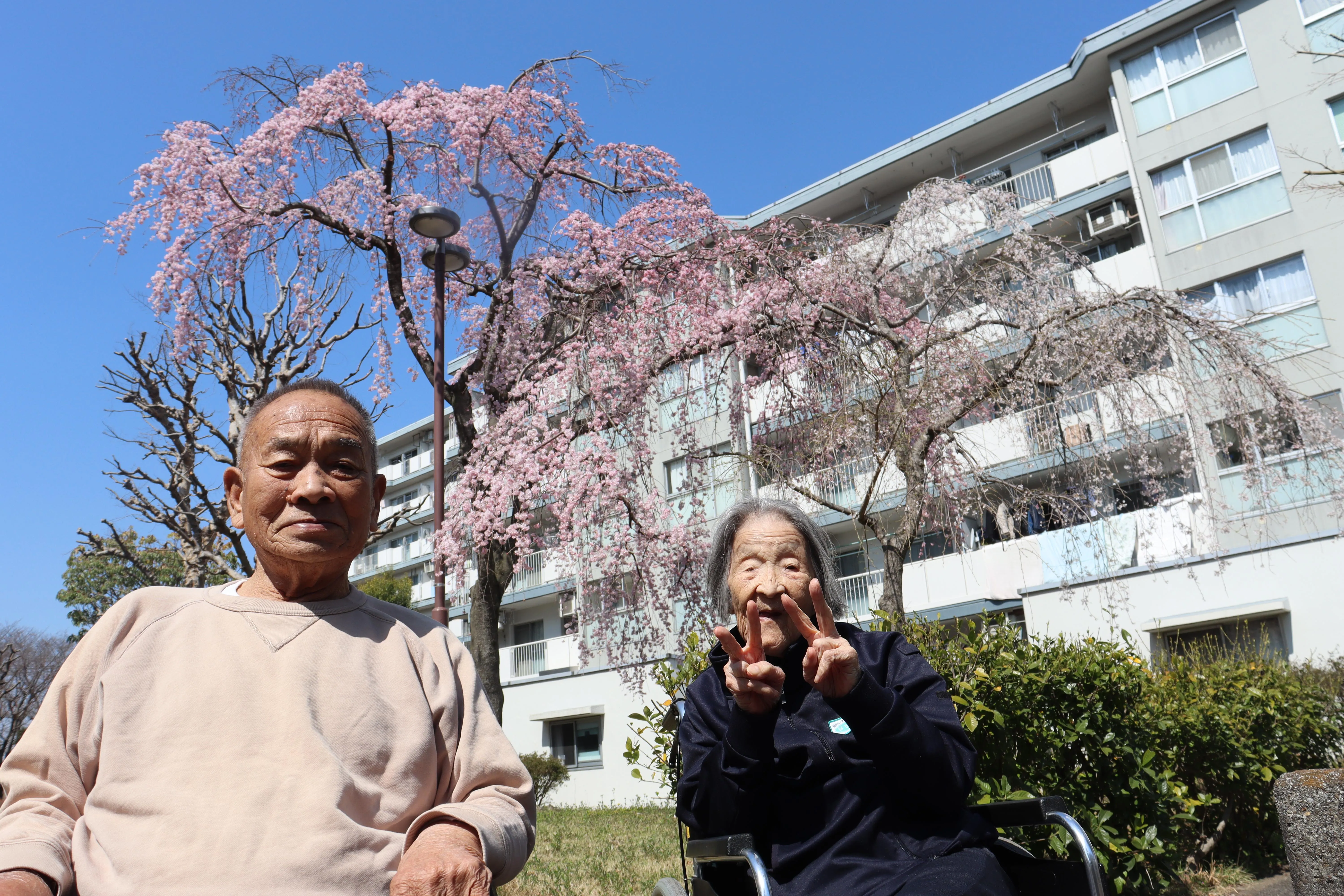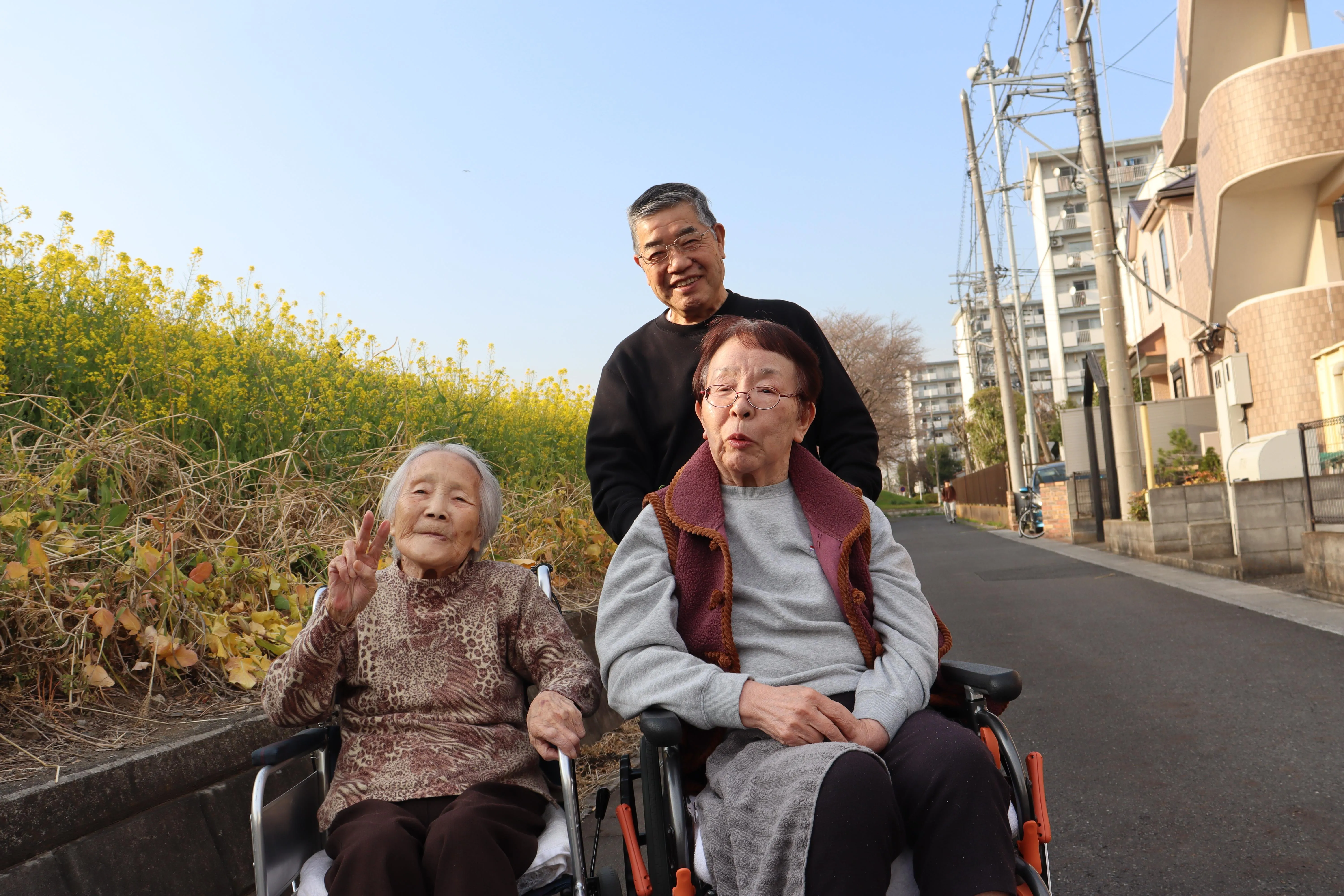 お天気も良く桜も咲き始めてきたので、施設の機能訓練指導員と共に少人数でのお花見散歩に外出です。桜や菜の花がとてもキレイでした。