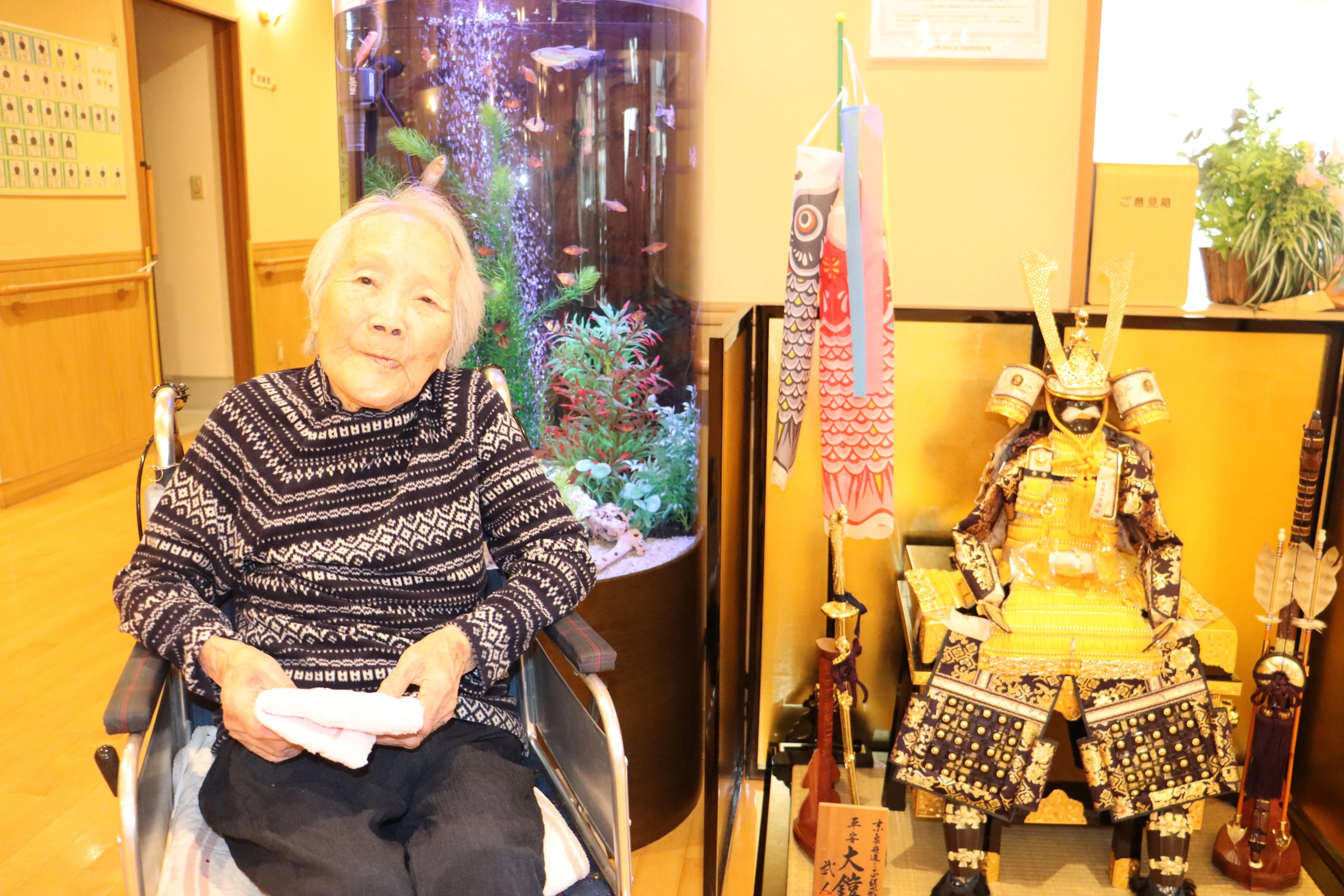 来月の端午の節句に向け鎧兜登場!いち早くエントランスホールに来られた女性のお客様と、記念撮影です。「はいチーズ!」