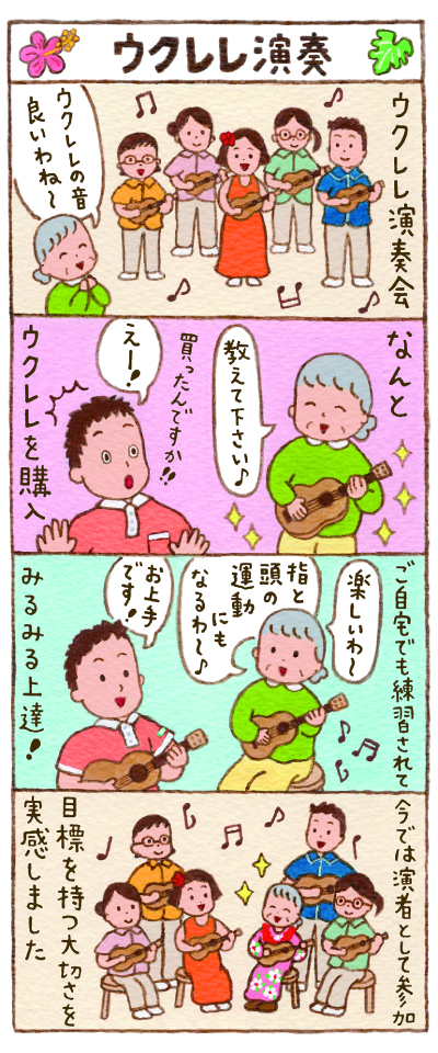 一緒に演奏しましょうとお誘いしてウクレレチームは6人に。「楽しい!それにみんなで演奏するとミスしても分からないわ。頭と指の運動にもなるしね。」と一生懸命練習されるお客様に、音楽の力と目標をもつことの大切さを教わったスタッフでした。