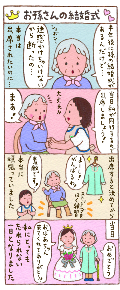 訪問介護のケアで訪問したスタッフに、「孫の結婚式に呼ばれたけれど・・」と悲しそう断ったことをお話するお客様。ご家族と相談してスタッフが結婚式に同行*してお客様をサポートすることになり・・。