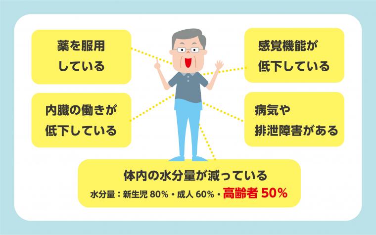 加齢に伴い、食欲の減退や食べ物を飲み込む嚥下機能の低下が生じると、水分の摂取量が減ってきます。また、体液を多く蓄積する筋肉量が落ちることも体内の水分量が減ってしまう原因です。